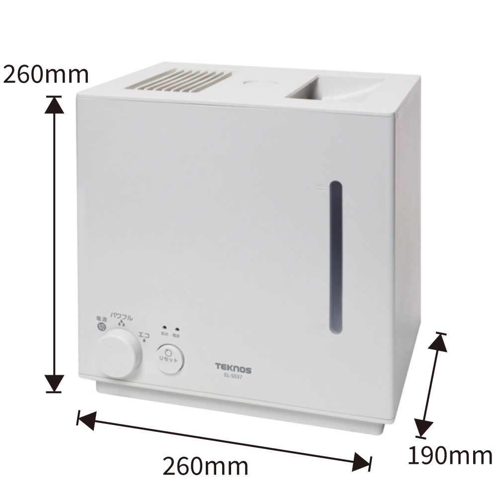 ●中国製●材質/ABS、PP●電源/100V●電源コード長さ/1.5m●加湿能力/0.4L/h●消費電力(50/60Hz)/400W●タンク容量/3.7L●加湿能力/400ml/h●保証期間/1年