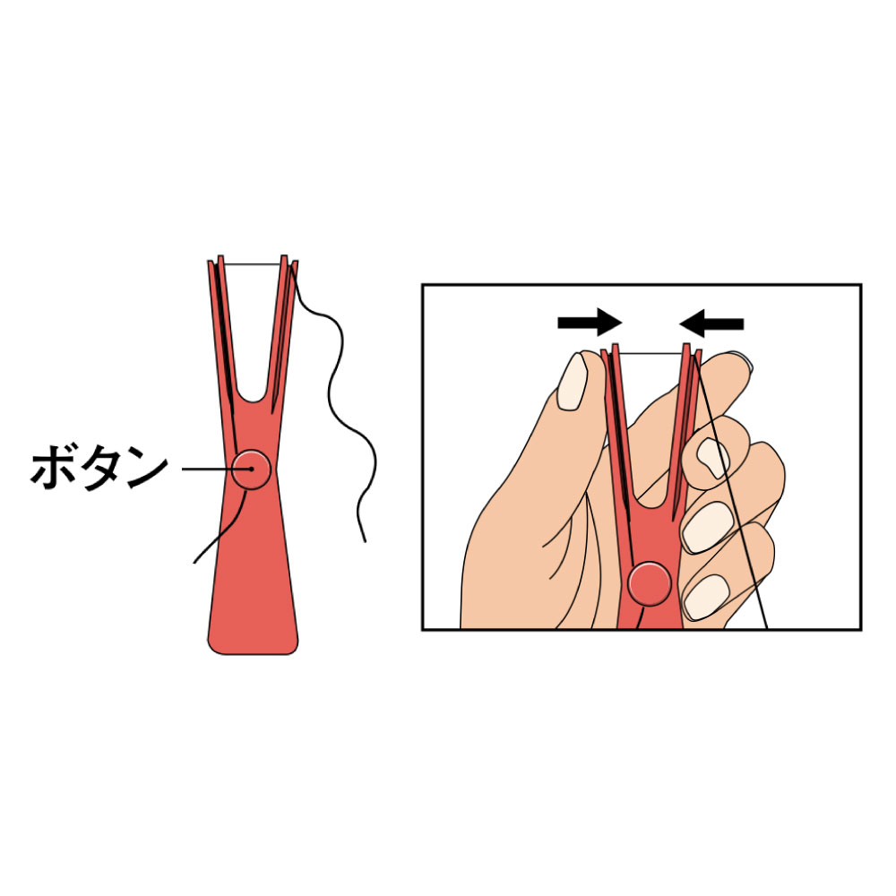 【使用方法】約30-40cmフロスを切りとります。フロスの一端をボタンに2、3回しっかり巻きつけます。溝に沿ってフロスをかけてください。フロスをかけ終えたら、ボタンに2、3回しっかり巻きつけます。ハンドルを内側に少しおさえてフロスをかけるとしっかり張れます。1回使用後は、フロスを張り替えて使用してください。また、使用後はフロスメイトハンドルを水で洗って乾燥させて保管してください。フロスメイトハンドルは繰り返し使用することができます。