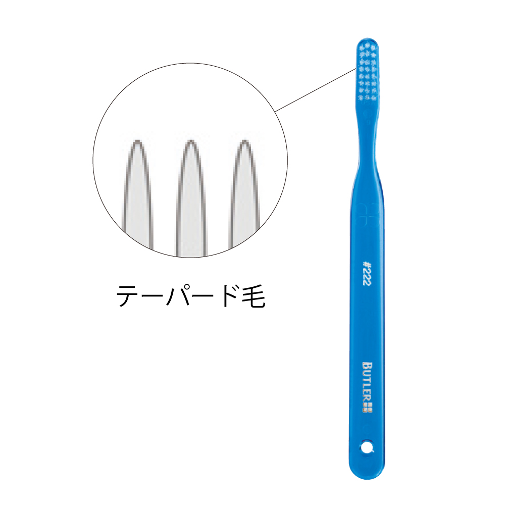 正しいブラッシング指導に適したハブラシ。コンパクトなヘッドで口腔内の操作性がよく臼歯部や舌側面の刷掃に効果的。ペングリップで持ちやすいストレートハンドル。テーパード加工・サテナイズド加工。