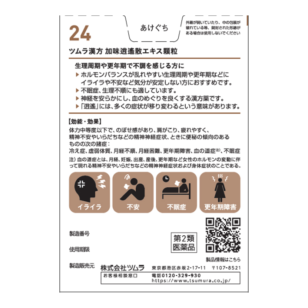 女性のホルモンバランスの乱れによるイライラや不眠症、冷え症など、原因のはっきりしない「不定愁訴」によく用いられる漢方薬です。生理周期や更年期に不調を感じる方に適しています。