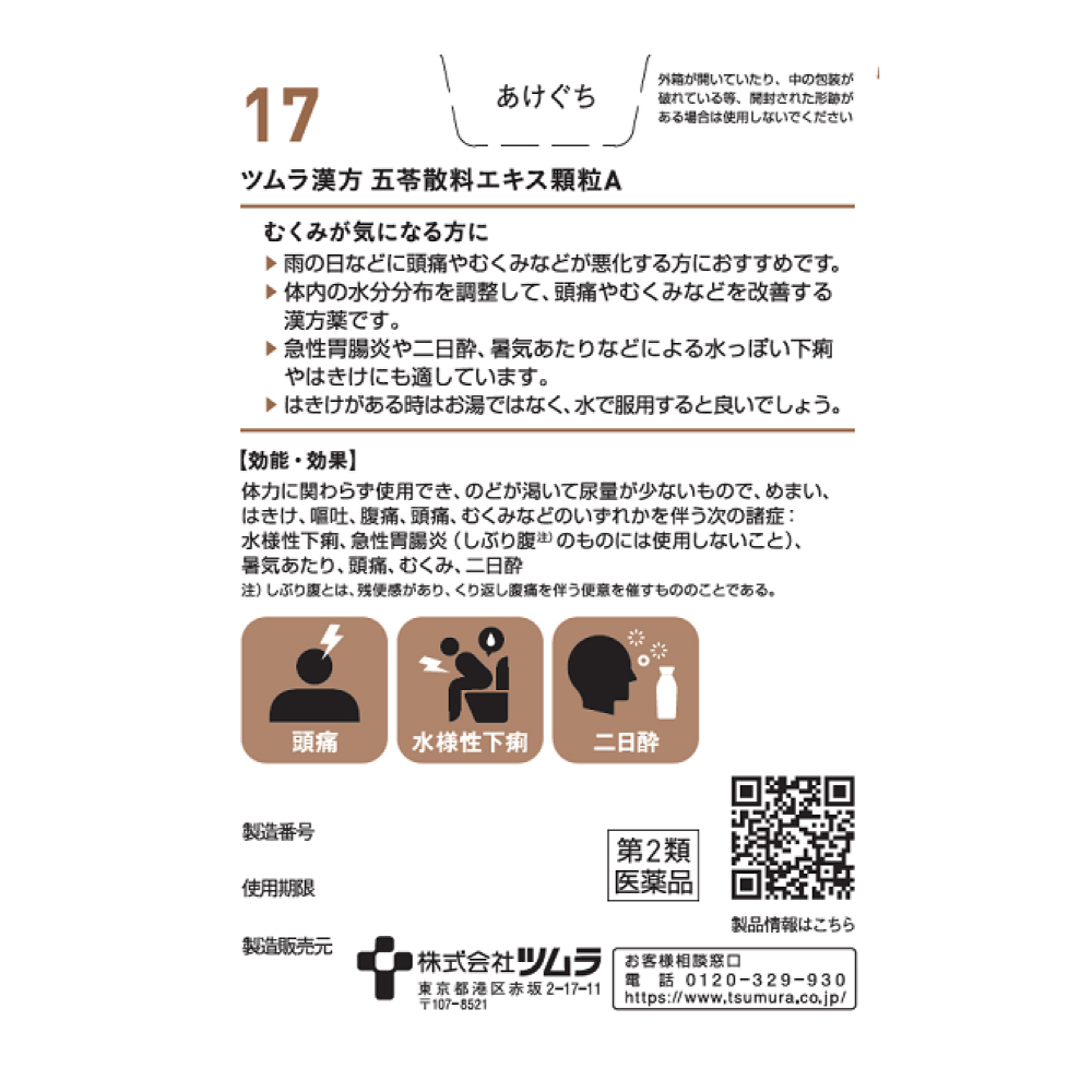 「水」が滞っている部位からは排出を促し、足りない部分には補うことで、体内をめぐる「水」のバランスを整えます。「水」のバランスが崩れて起こる症状には二日酔や気圧の変化による頭痛などがあり、五苓散はこれらの症状を改善します。