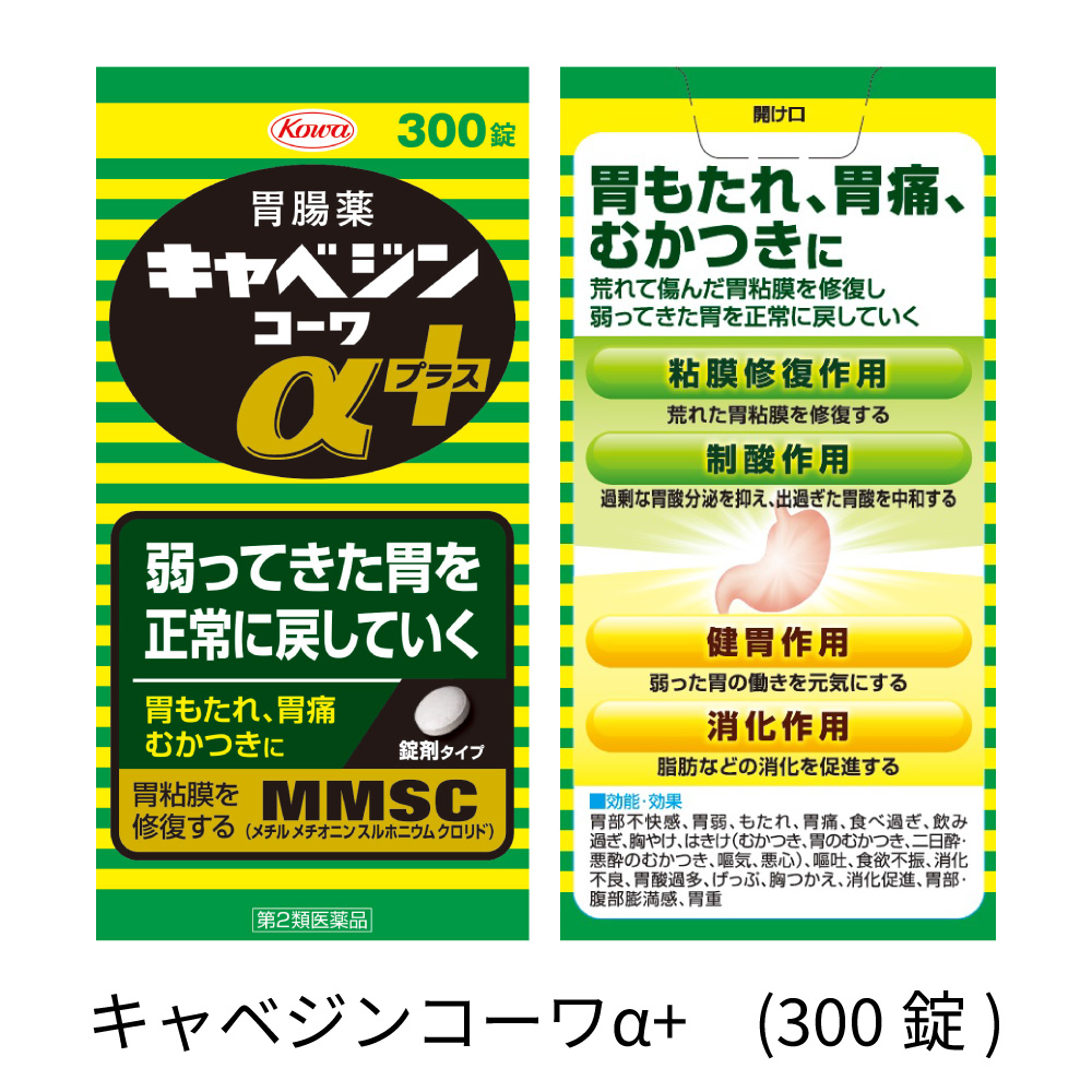 キャベツの絞り汁から発見された胃粘膜修復成分MMSC※を配合し、荒れて傷んだ胃粘膜を修復します。※メチルメチオニンスルホニウムクロリド制酸剤の働きにより、過剰な胃酸分泌による刺激から胃を守ります。健胃作用のある生薬コウボクやソヨウ、脂肪の消化を促進するリパーゼAP12などを同時配合。外層と核錠との二層構造にすることで、各有効成分が効果的に働きます。弱った胃の働きを元気にしていきます。