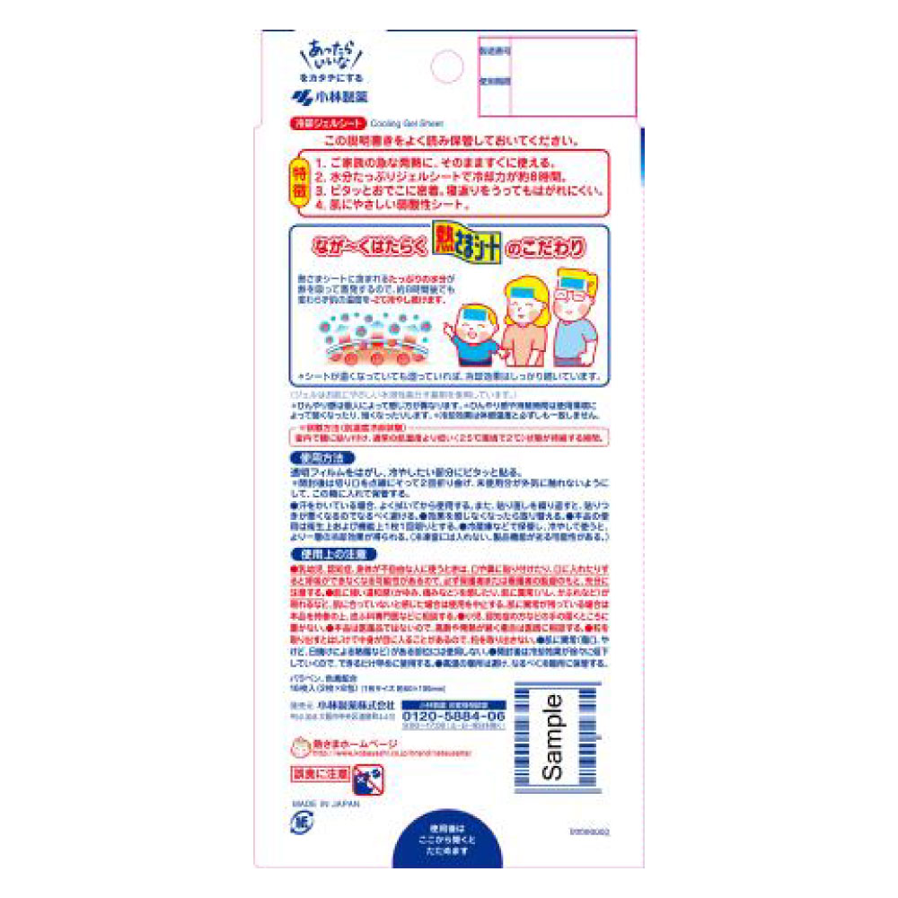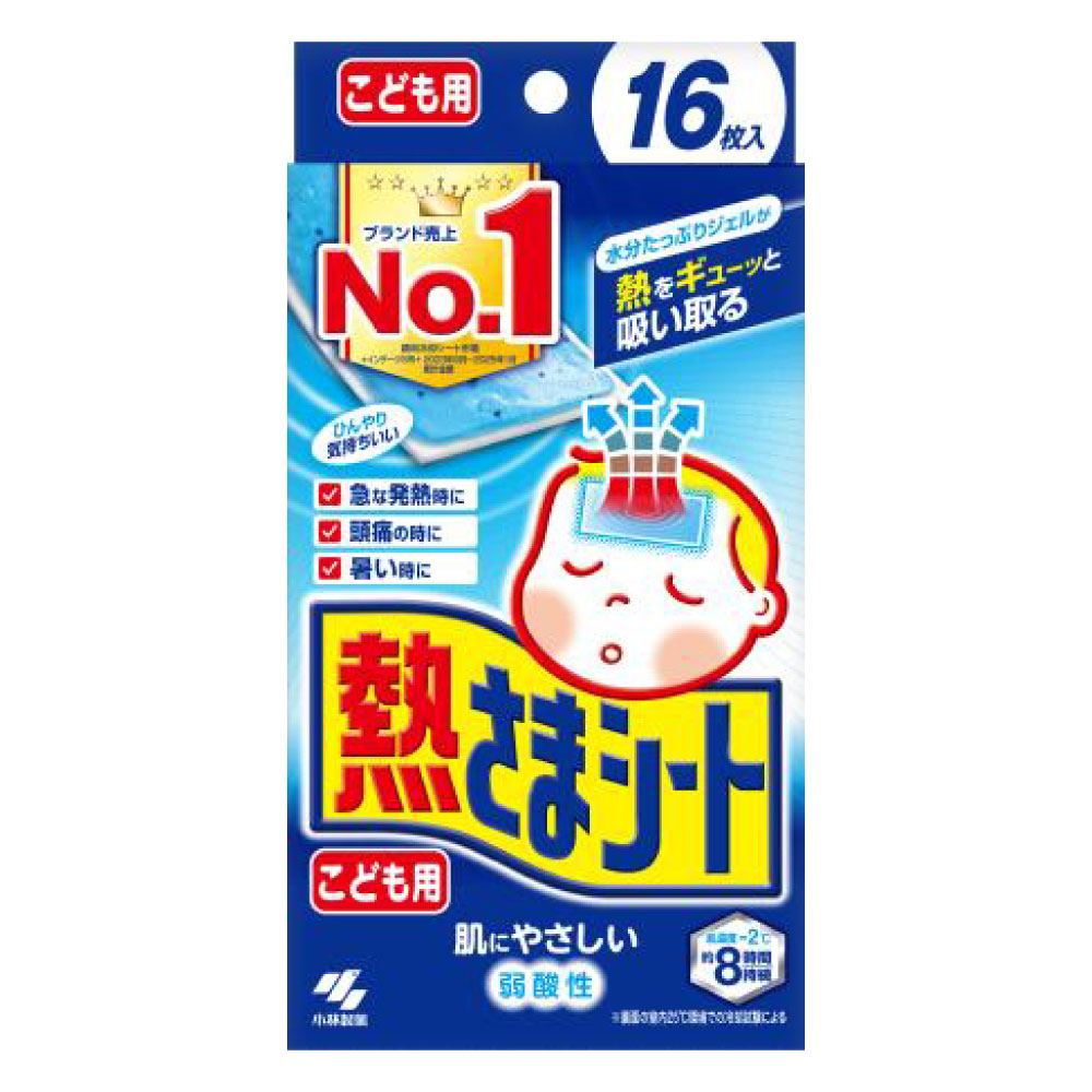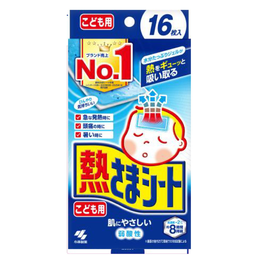 急な発熱に、そのまますぐに使えます。水分たっぷりジェルシートで冷却力が約8時間続きます。ピタッとおでこに密着。寝返りをうってもはがれにくいです。肌にやさしい弱酸性シートです。こども用は大人用よりシートが小さく、メントールの量が少ないです。大人用はこども用よりシートが大きく、メントール量が多いです。