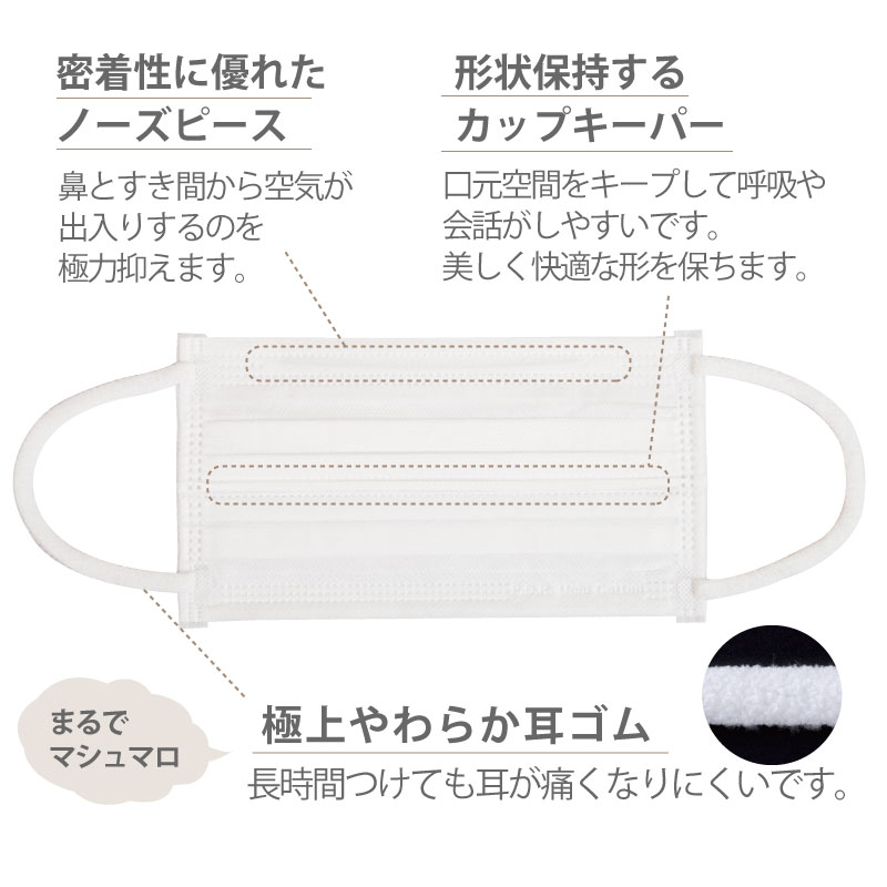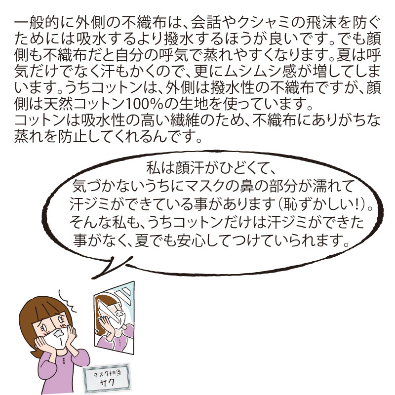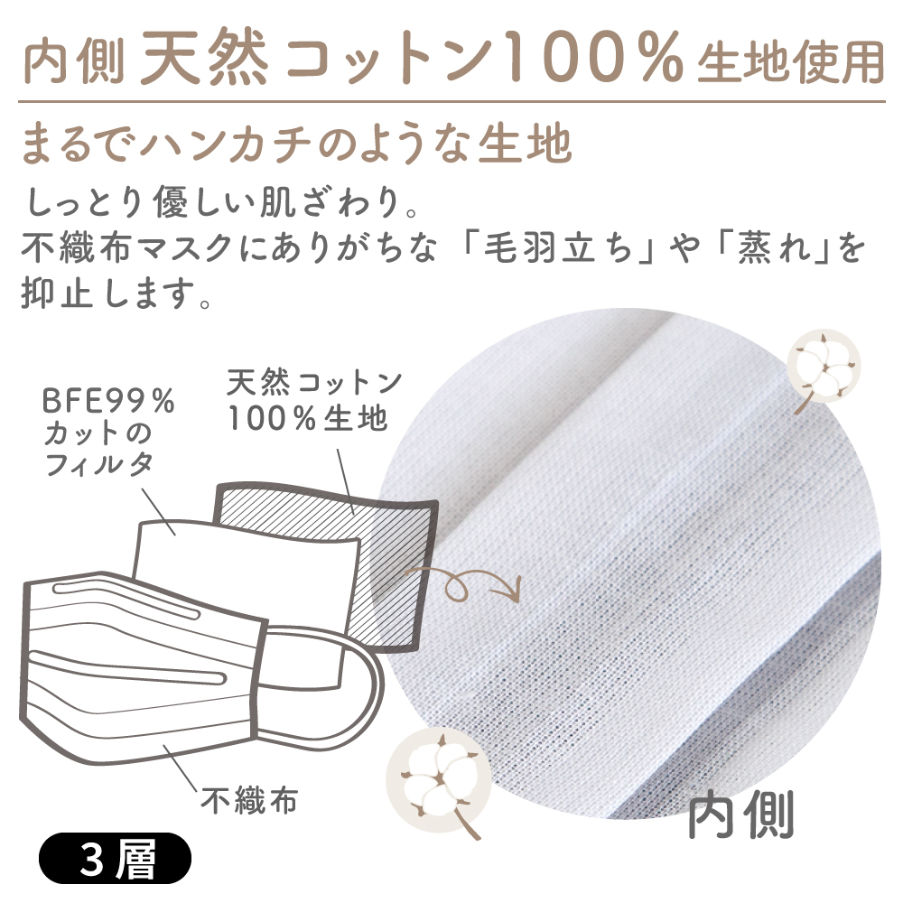 内側は天然コットン100%、外側は不織布、真ん中にカットフィルターを挟んでいるため、肌へのやさしさと感染対策を両立できるマスクです。