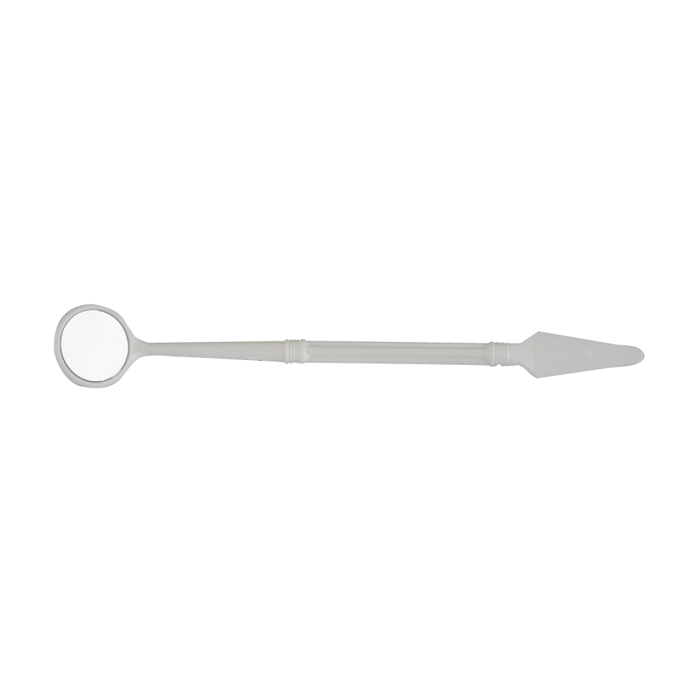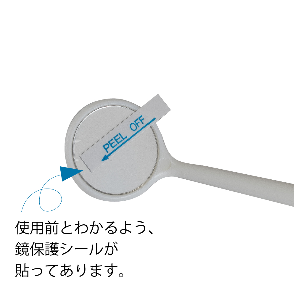 未使用とわかる保護シール付きディスポミラー。検診でもお使いいただけます。柄の後部がヘラの形状になっています。