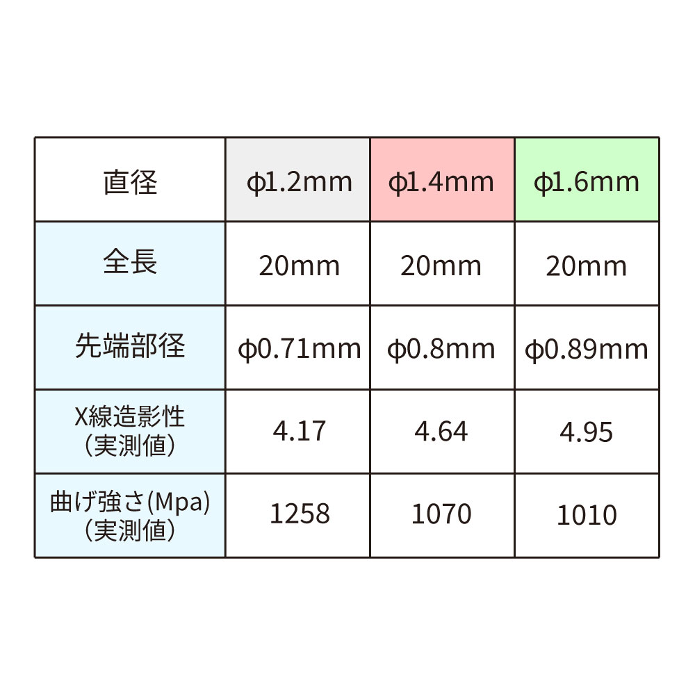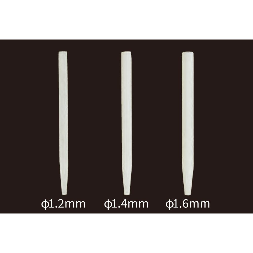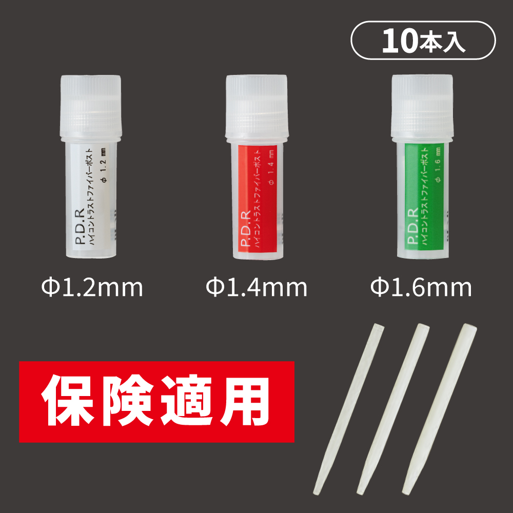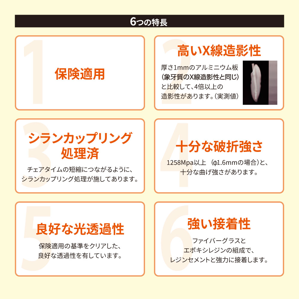 高いX線造影性です。(アルミニウム板4mm相当以上のX線造影性あり)シランカップリング処理済み。(チェアタイムの短縮に繋がるよう、シランカップリング処理済み)十分な破折強さ。(例:φ1.2mmのポストでは1258Mpa以上と、十分な曲げ強さ)良好な光透過性。(保険適用の基準をクリア)強い接着性。(ファイバーグラスとエポキシレジンの組成でレジンセメントと強力に接着)