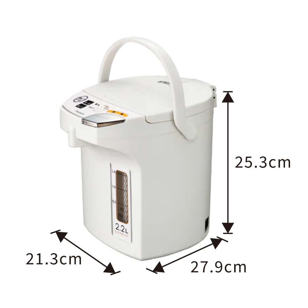 ・電動給湯なので軽く押すだけで給湯できます。・注ぎ口が見えやすく、注ぎこぼしややけどを防ぐ安心設計。・再沸騰ボタンを押せば保温状態のお湯が数分で沸騰状態になります。・コードを引っかけても、すぐに外れる安全なマグネット式プラグ。・上ぶたが着脱式なので、水の入れ替えや毎日のお手入れが簡単です。・空だき防止機能付。