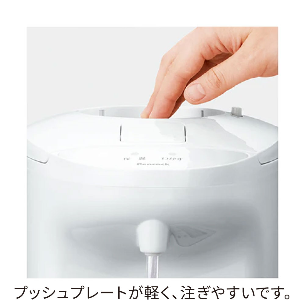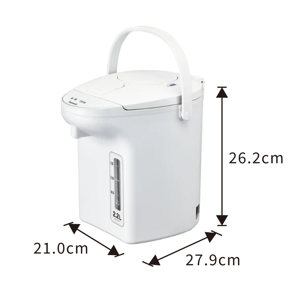 ・大きなプッシュプレートなので、軽い力でらくらく給湯。・エアー給湯式なので電源コードが刺さっていない状態で給湯できます。(コードレス給湯)・沸騰タイプではありません。湯沸かし時の最高温度は約95℃になります。・上ぶたが着脱式なので、水の入れ替えや毎日のお手入れが簡単です。・コードを引っかけても、すぐに外れて安全なマグネット式プラグ。・空だき防止機能付。