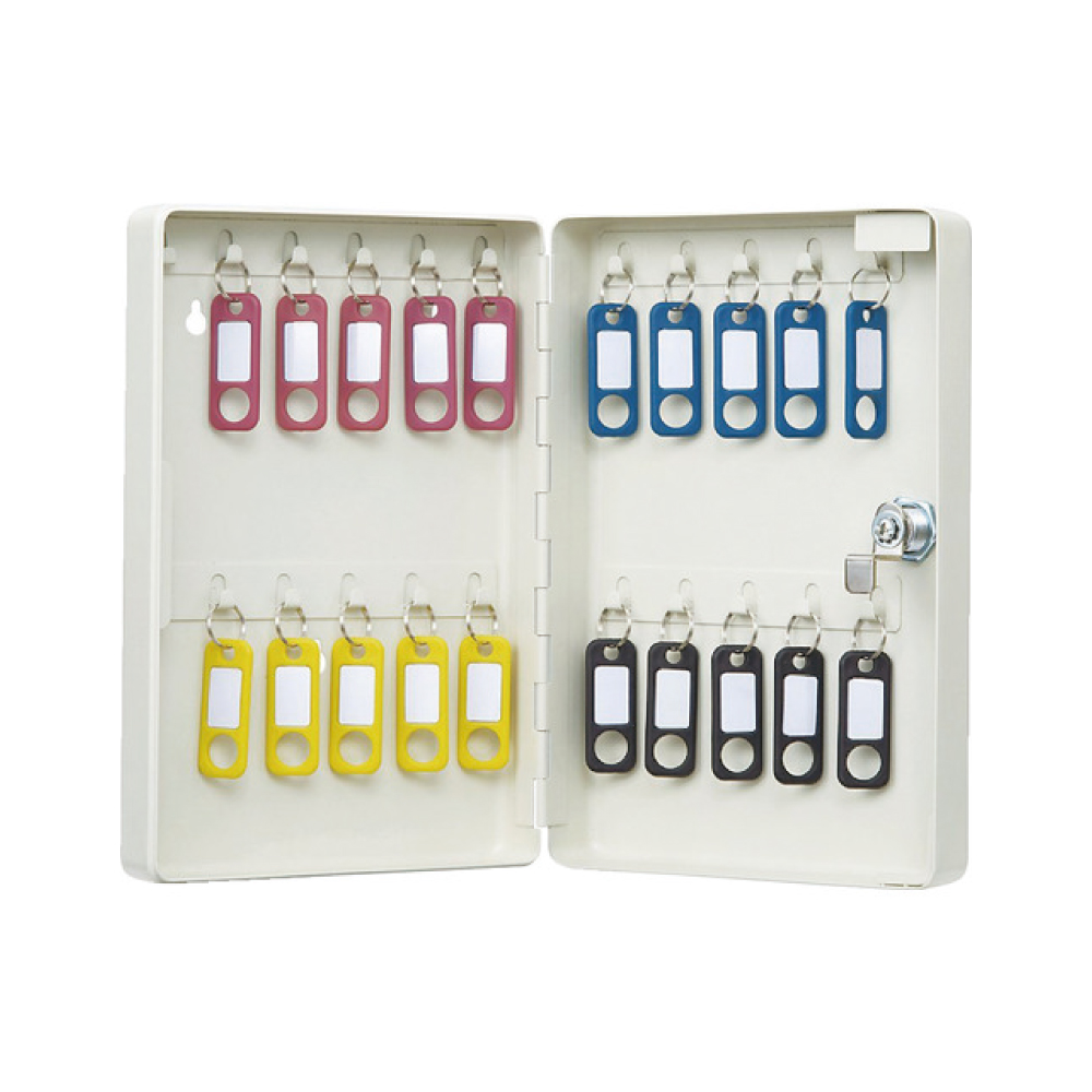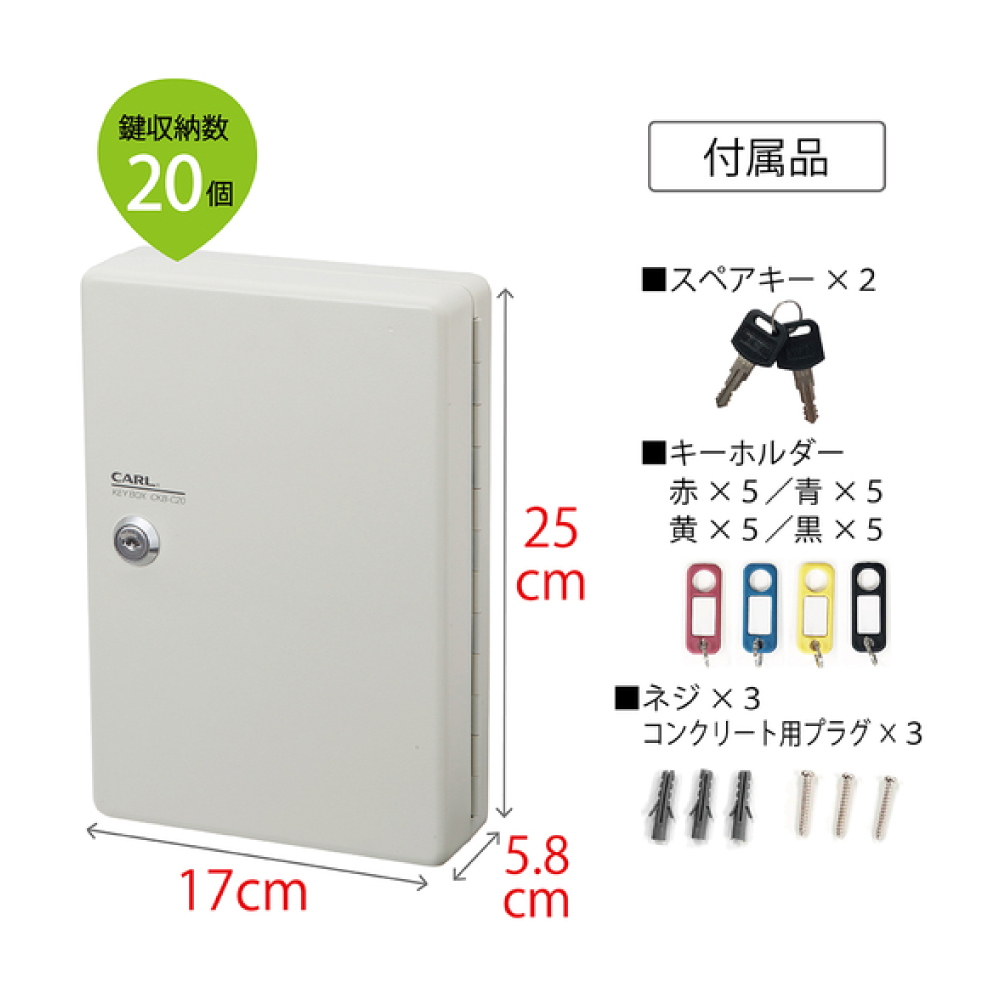 【セット内容】本体×1台、スペアキー×2本、キーホルダー(赤、青、黄、黒×各5個入)、取付用ネジ×3本、コンクリート用プラグ×3個●中国製●材質/本体:スチール キーホルダー:ポリプロピレン●質量/1000g●鍵収納数/20個●ホルダ数/20個●シリンダ錠式●壁掛け用穴付(3ヶ所)