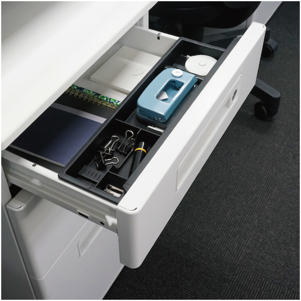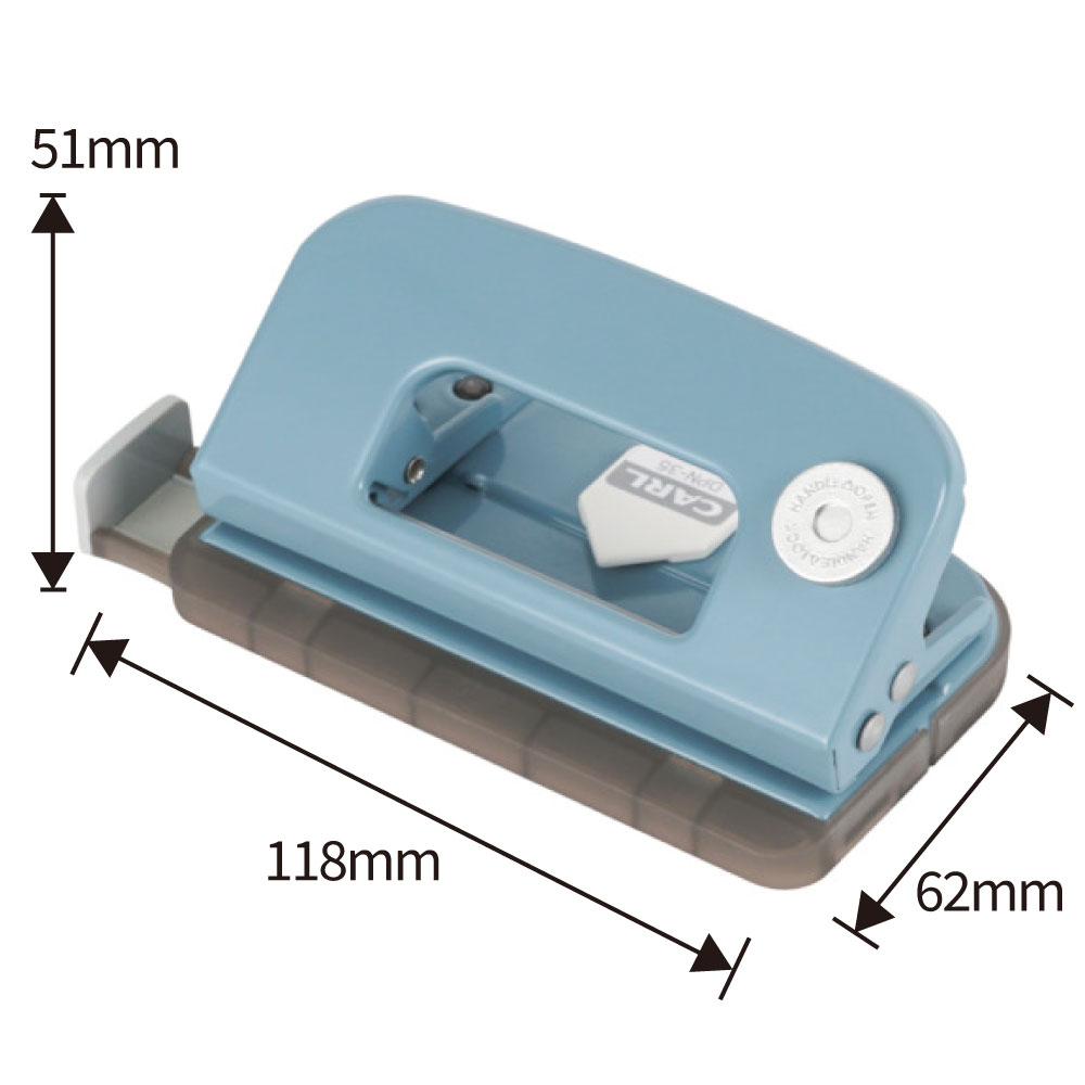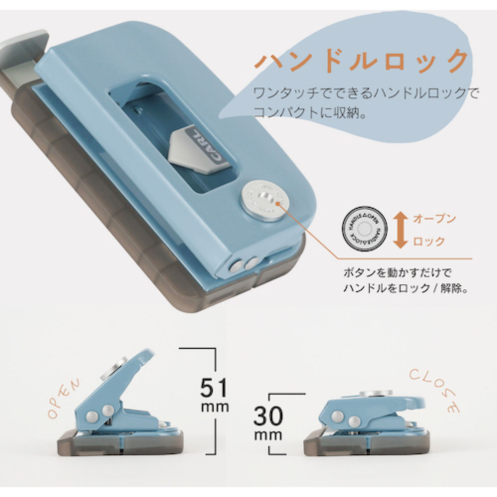 見やすくしっかり中央合わせができるサイドゲージは、A4長辺4穴にも対応しています。抜きカスが見やすい半透明クズ受けは、開閉式の為、カバーごと取り外す必要がありません。ハンドル部分を押し下げた状態でロックできるので、引き出し等にもコンパクトに収納できます。軽量でコンパクトなので、机の上に置いた状態はもちろん、片手で手に持った状態でも扱えます。