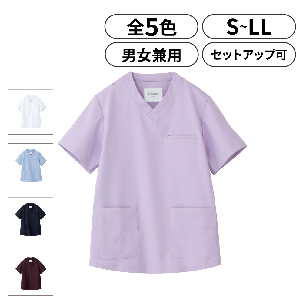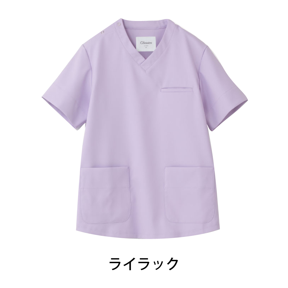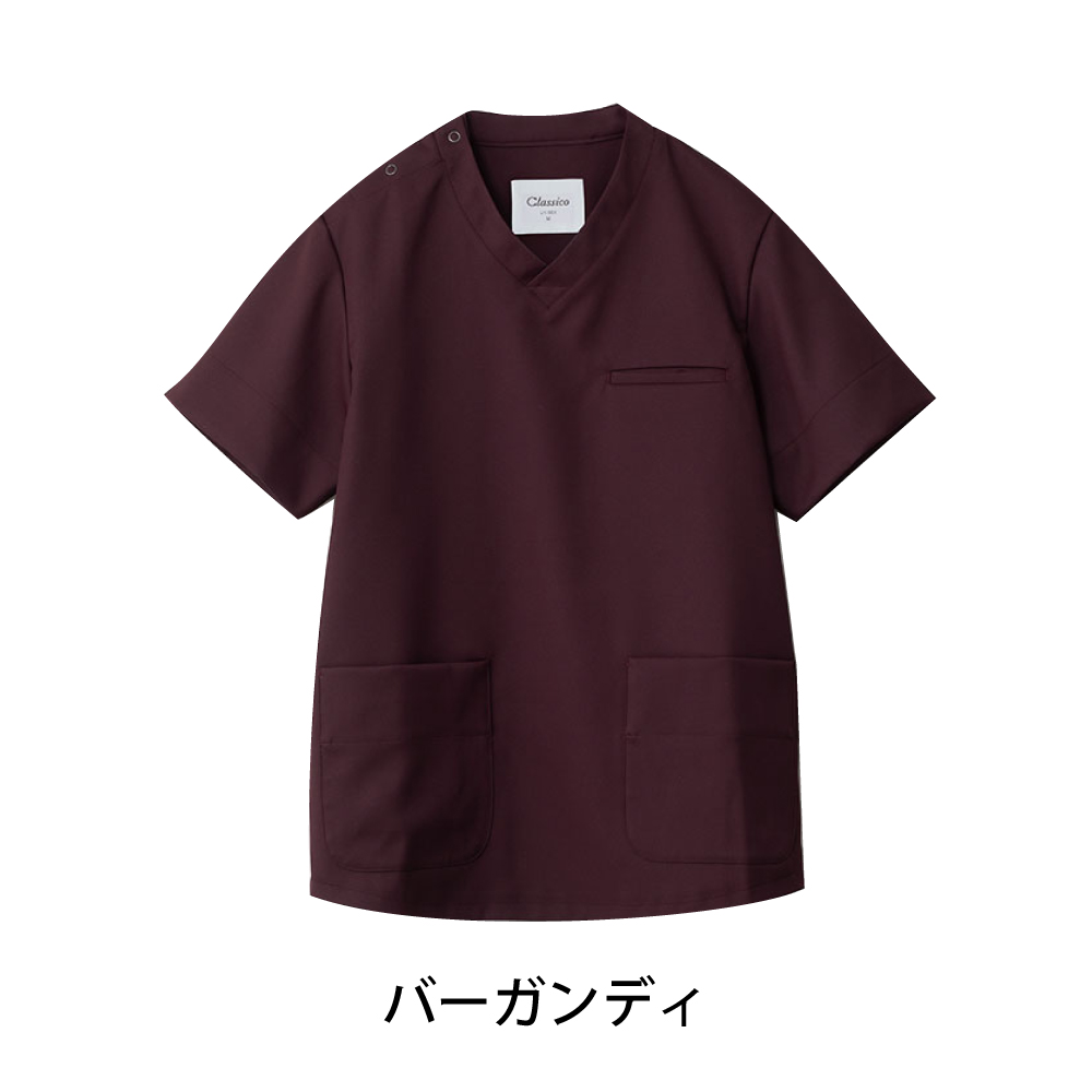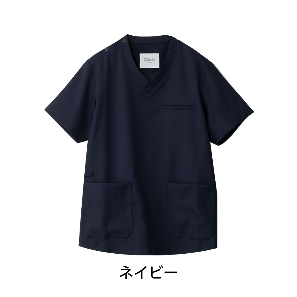 動きやすく、トレンド感のある直線的なシルエットの男女兼用のスクラブです。
