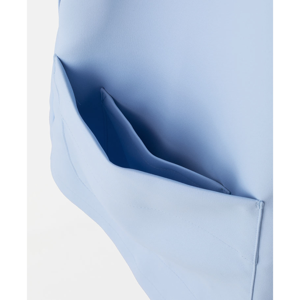 お尻が隠れる長めの着丈です。首の後ろにストラップフックが付いています。工業洗濯対応。なめらかな肌触りと軽い着心地です。汗をかいてもサラサラをキープする吸水速乾性。透け防止効果の高いフルダル糸を使用しています。肌面に静電子を織り込み、気になる静電気を防止。アイロン無しでもシルエットをきれいに保ちます。汚れが落ちやすい加工をしています。