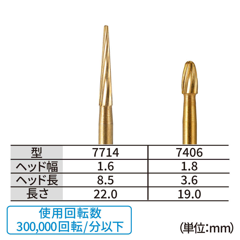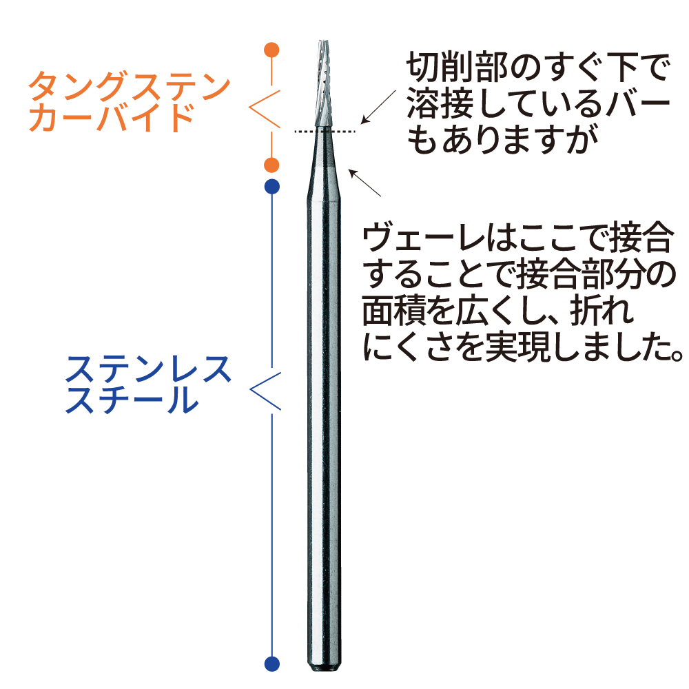 ドイツ製高品質タングステンカーバイドを使用。よく削れます。タングステンカーバイド製(ヘッド部)とステンレススチール製(シャンク部)の2ピース構造。ネックとシャンクの接合部分を工夫することによって折れにくさを実現。シンプルなブリスターパックでコストを抑えました。