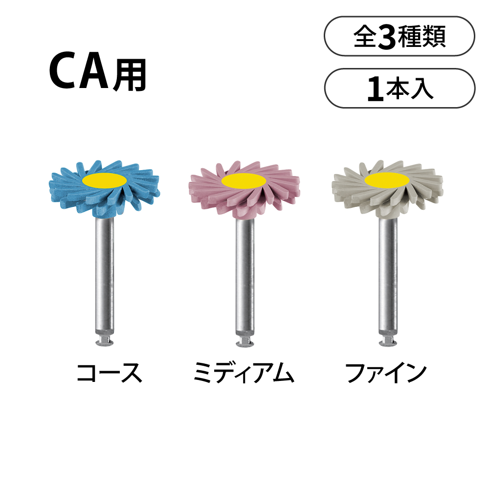ジルコニア・二ケイ酸リチウムガラスセラミック・ポーセレン・メタル、ハイブリッドレジンなどの中研磨から最終光沢研磨までをチェアーサイドで行えるCA用・ブラシ状ダイヤモンドポリッシャーです。