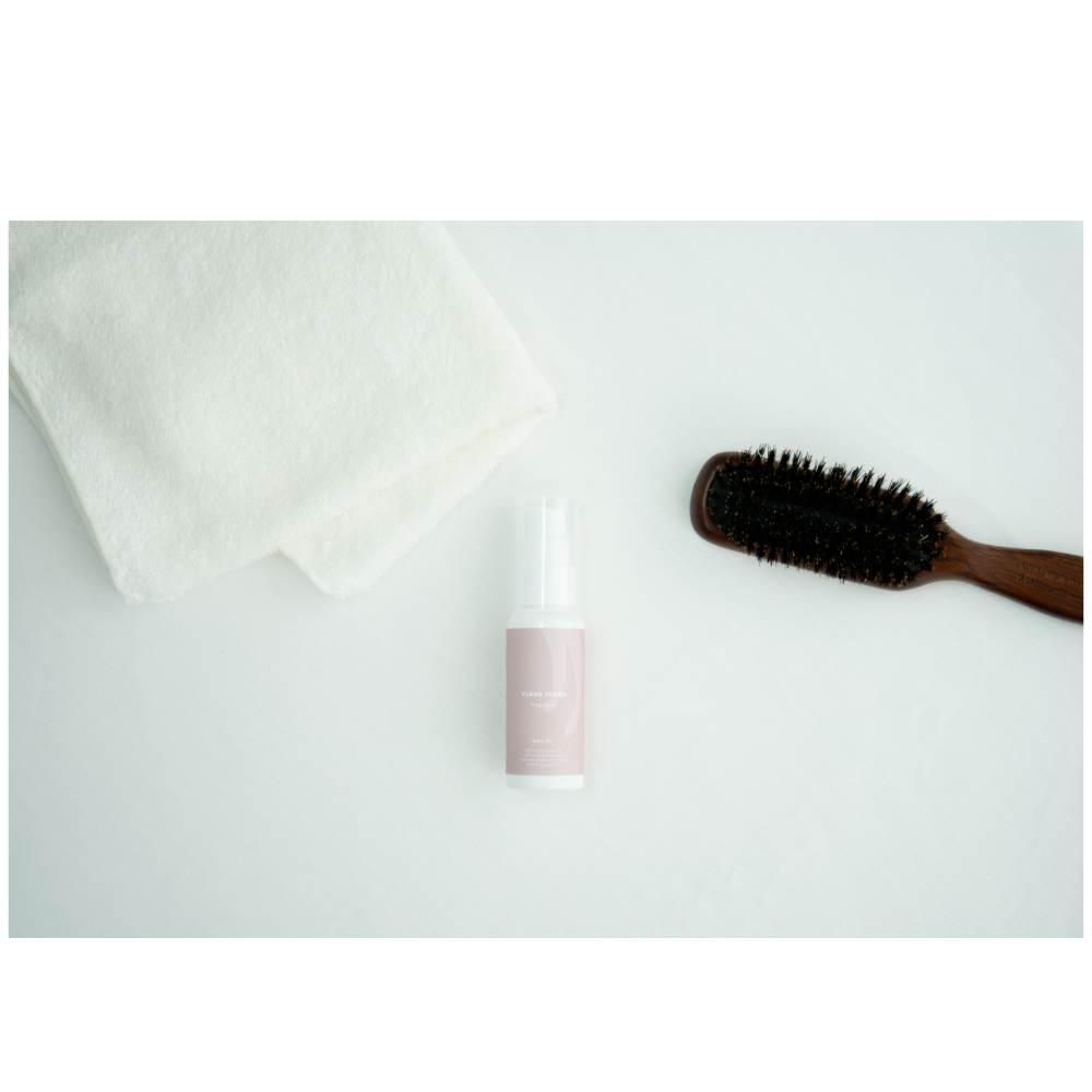 スタイリング剤として髪にうるおいとツヤを与え、さりげなく香りをまとわせます。ドライヤー前のヘアトリートメントとしてもお使いいただけます。イランイランエッセンシャル(天然芳香成分)配合。5種の植物オイル(コメヌカオイル、ホホバオイル、スイートアーモンドオイル、アルガンオイル、ツバキオイル※すべて保湿成分)配合。