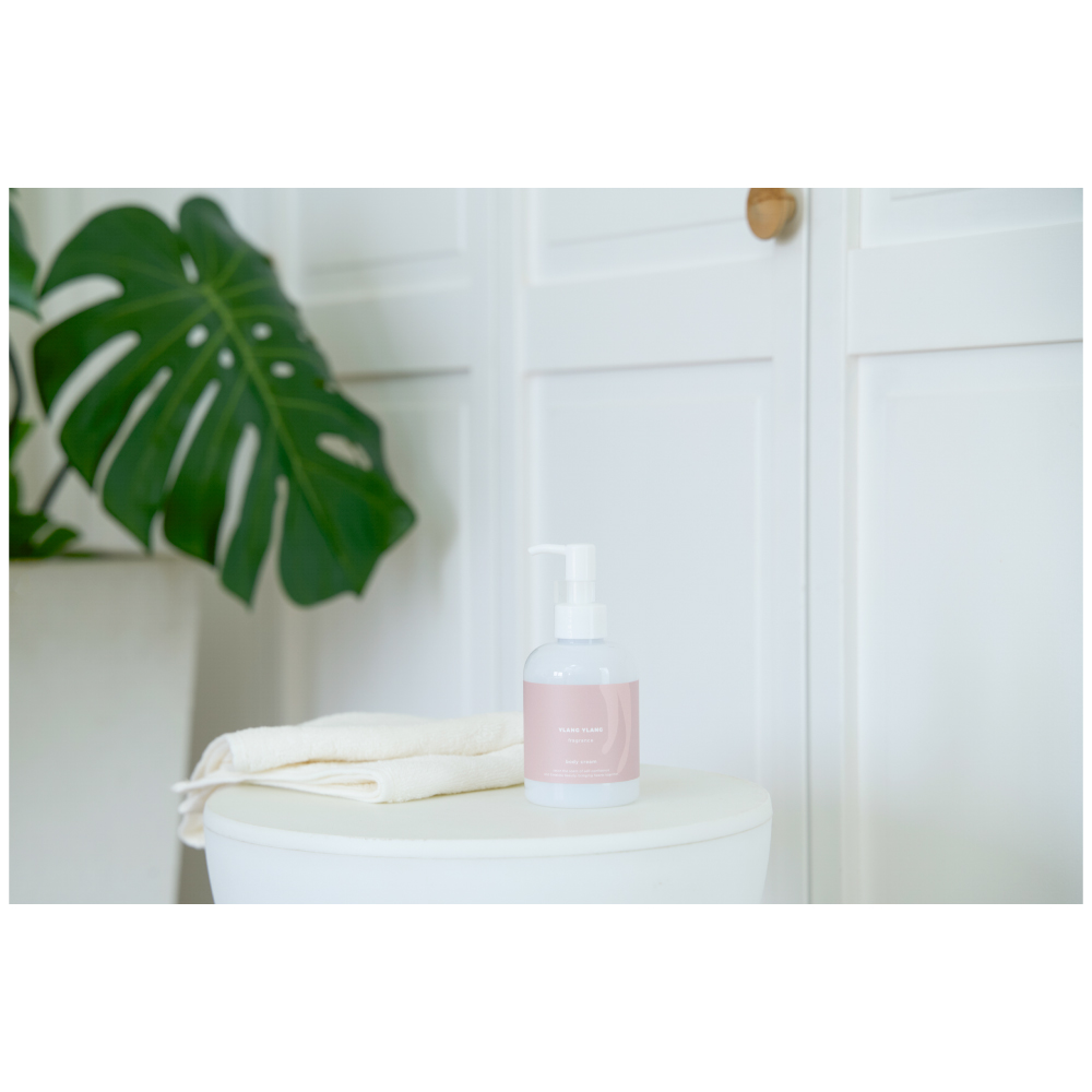 甘く華やかな輝きの奥に神秘的な魅力を感じる、フルーティーフローラルの香りです。入浴後、タオルドライで水分が残っている肌にもなじみやすい処方なので忙しい方や、入浴後すぐ保湿したい方にもおすすめです。(浴室用ではありません)。伸びが良いのでマッサージクリームとしてのご使用にもおすすめです。うるおいは持続しつつべたつかないので季節問わずお使いいただけます。イランイランエッセンシャル(天然芳香成分)配合。シアバター5%、スクワラン、ヒアルロン酸(すべて保湿成分)配合。