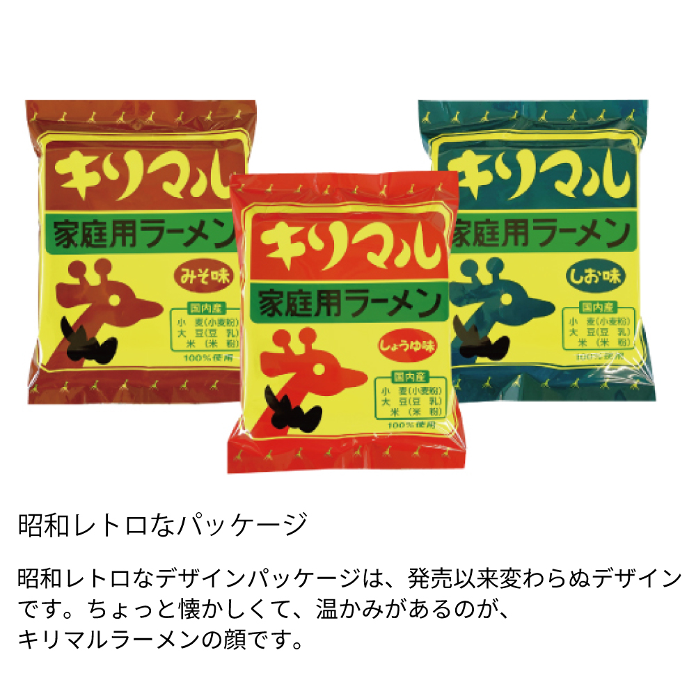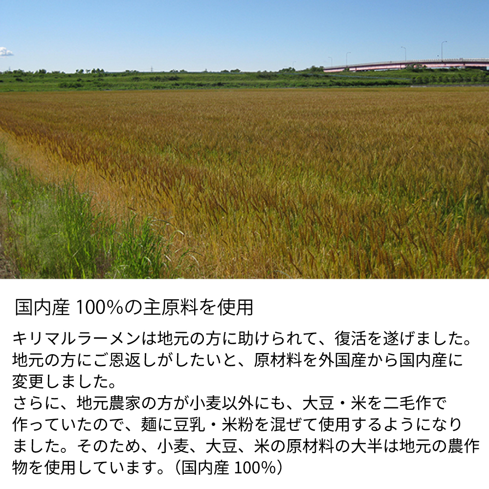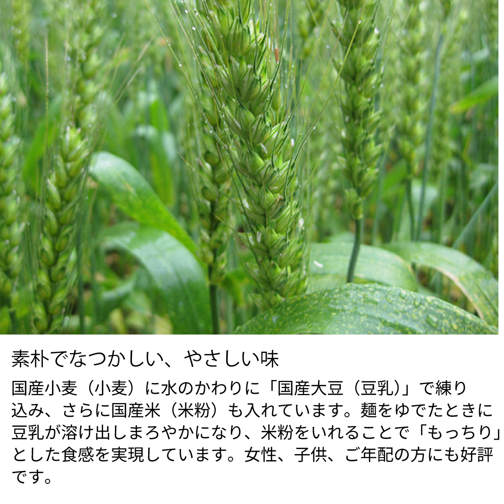 化学調味料不使用で、国産主原料(小麦・大豆・米)100%使用にこだわった即席ラーメンです。国産小麦(小麦)に水のかわりに「国産大豆(豆乳)」で練り込み、さらに国産米(米粉)も入れています。麺をゆでたときに豆乳が溶け出しまろやかになり、米粉をいれることで「もっちり」とした食感を実現しています。女性、子ども、ご年配の方にも好評です。