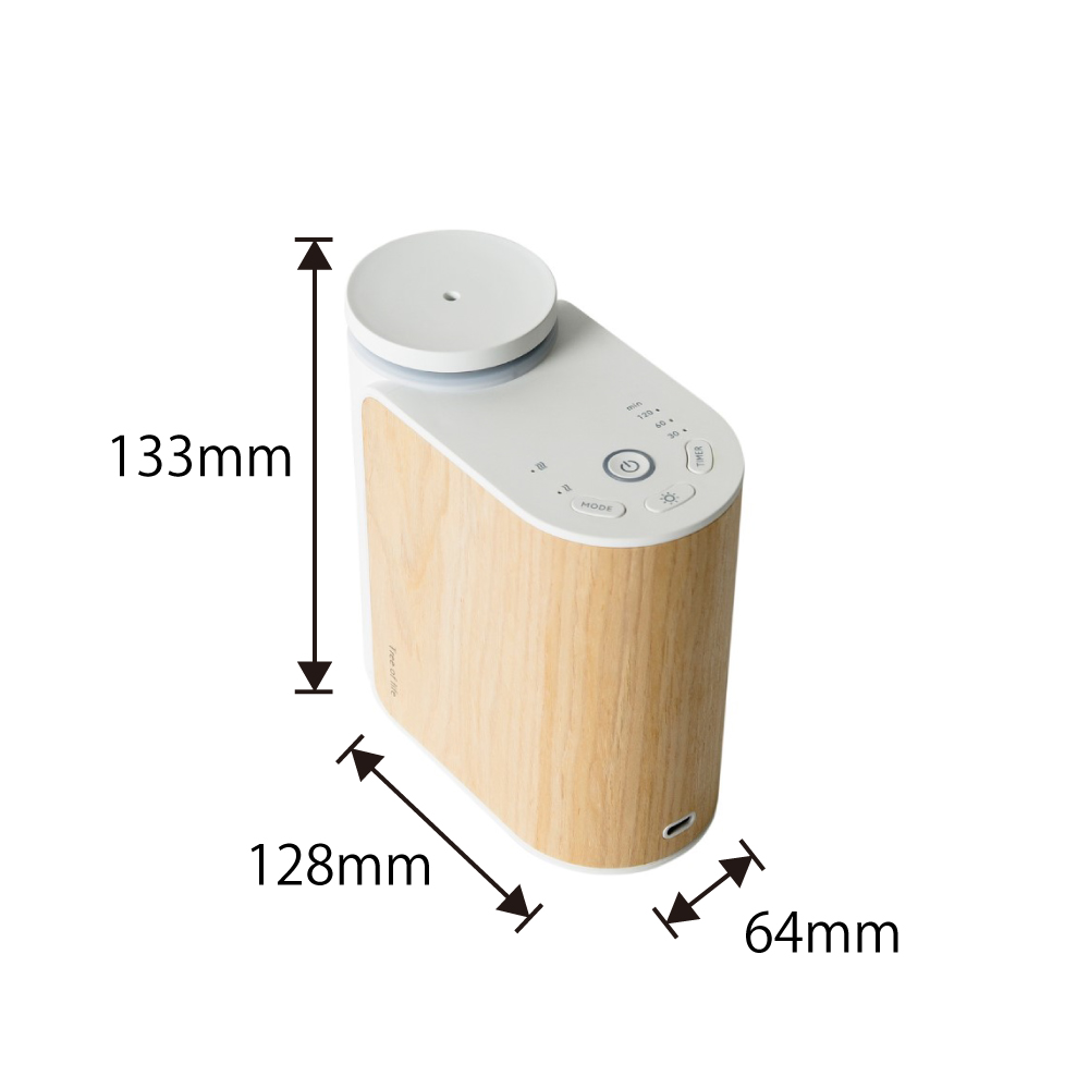 【セット内容】本体、30ml空瓶(本体装着)、ノズルキャップ(本体装着)、USBtype-Cケーブル、ドロッパーオープナー、取扱説明書●主な材質/PP、POM、天然木●サイズ/128×64×H133mm●商品重量/約470g●電源/5V 1.0A(USB充電式)●充電電池/リチウムイオン蓄電池 4000mA/3.7V●充電時間/約4~6時間●連続使用時間/約15~35時間(ライト点灯有無・モードによる)●モード/2段階(弱・強)●オフタイマー/30分、60分、120分、8時間●芳香範囲目安/約6~40畳(空調・使用環境や精油による)●USBケーブル長/約100cm●保証期間/1年間