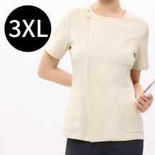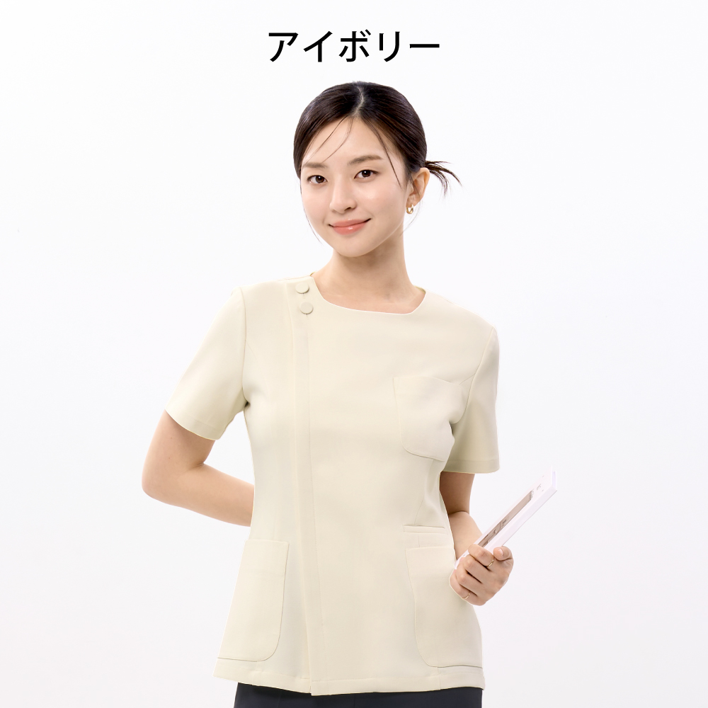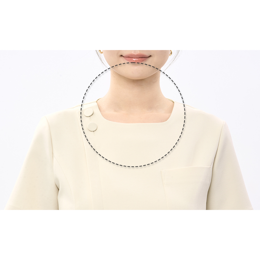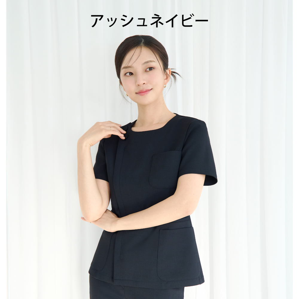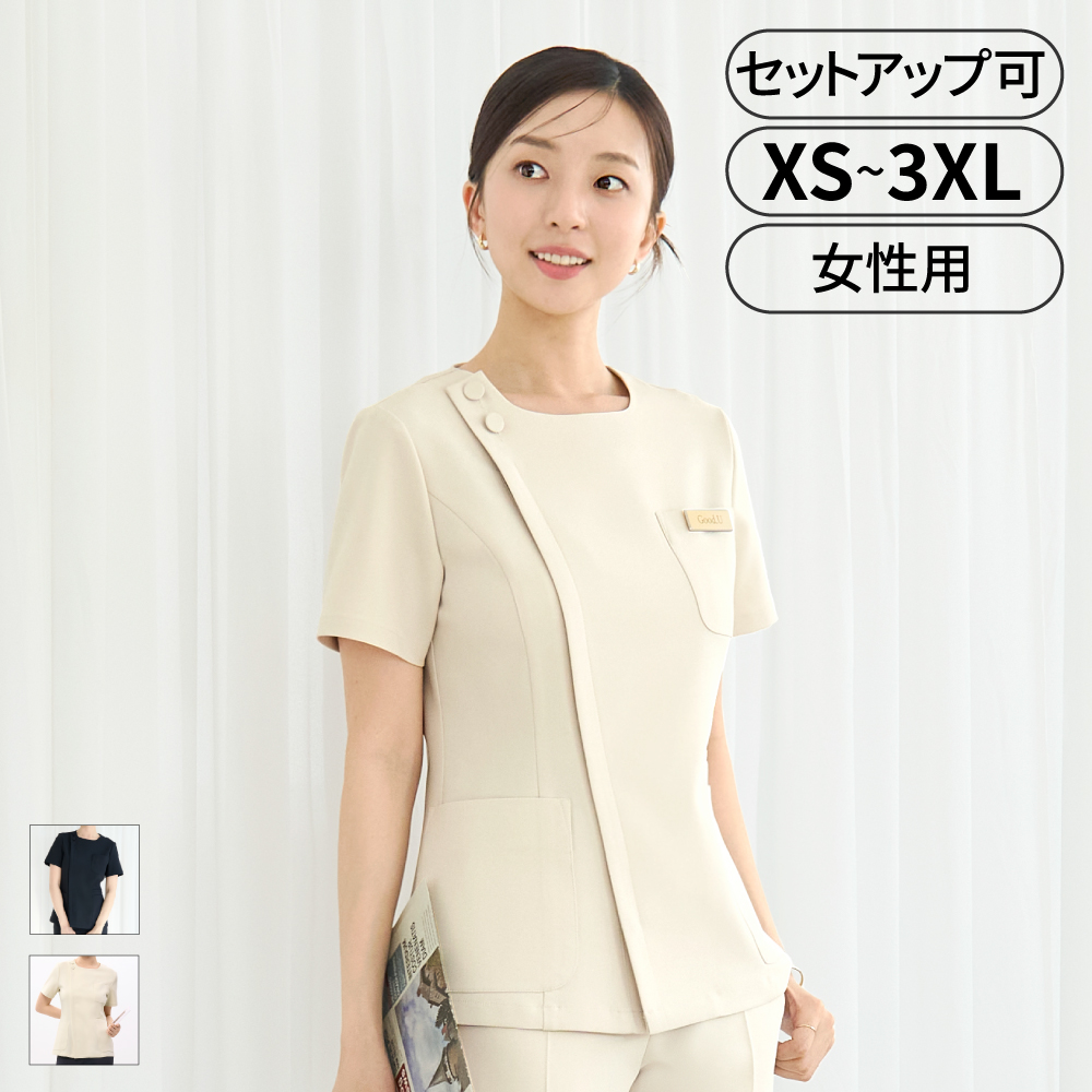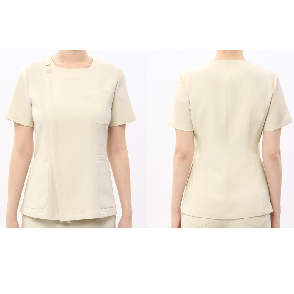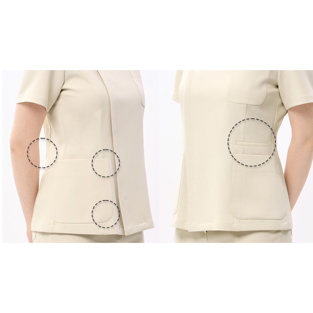 韓国のGoodU社のメディカルユニフォームです。スクエアネックが柔らかな印象の女性らしいデザインです。着脱が楽なフロントファスナー付です。【素材】ポリエステル95%、ポリウレタン5%。◇左胸ポケット/両腰ポケット(左側のみ二重ポケット)