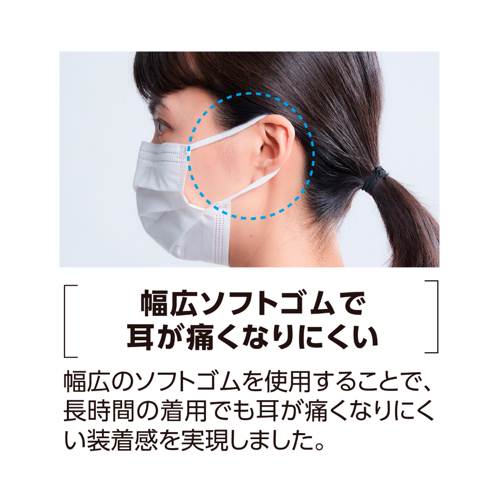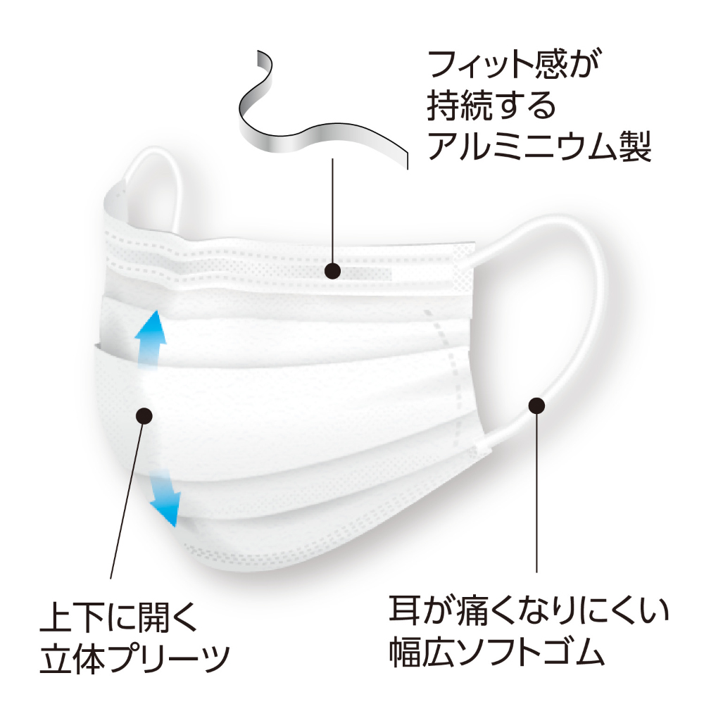 ノーズピースはアルミニウム製で、顔にぴったりとフィットし防護性を高めます。耳ひもには耳が痛くなりにくい柔らかい素材の幅広ソフト型を使用し、ポリエステル製(ラテックスフリー)のためアレルギーの方にも安心です。