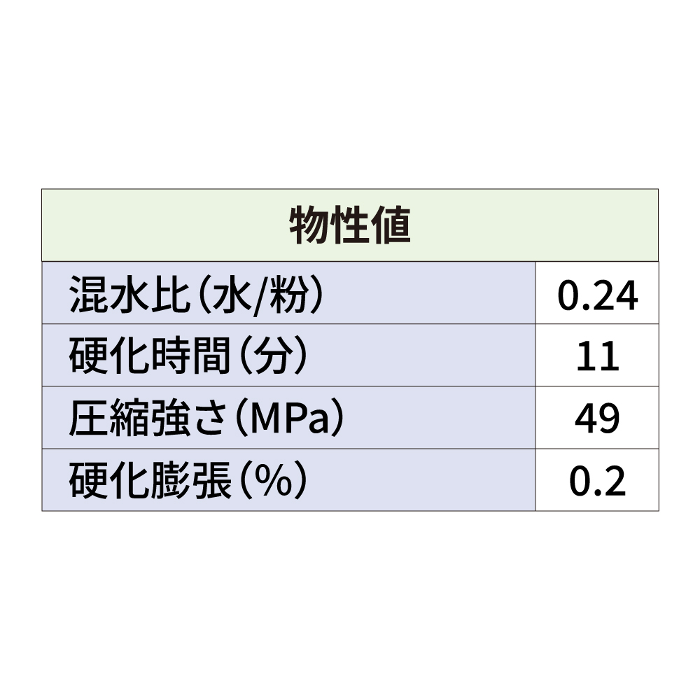●混水比/24%●硬化時間/11分●硬化膨張/0.20%●圧縮強さ/49MPa※一般的名称:歯科用硬質石こう 届出番号:13B3X00112000001、13B2X10233000001