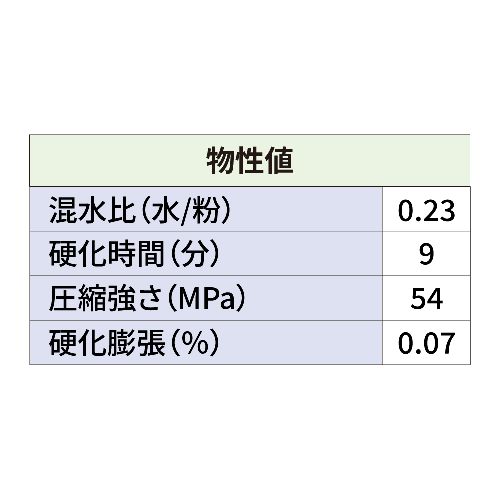 ●混水比/23%●硬化時間/9分●硬化膨張/0.07%●圧縮強さ/54MPa※一般的名称:歯科用硬質石こう 届出番号:13B3X00112000005
