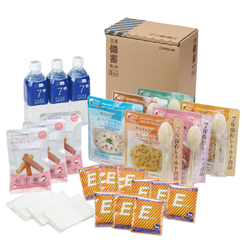【セット内容】ご飯(スプーン付)×6食(わかめご飯/五目ごはん/カレーピラフ/コーンピラフ/トマトリゾット/ホワイトシチューリゾット×各1食)、保存水(500ml)×3本、ポケットティッシュ×3個、クッキー(3本入)×3袋、非常用簡易トイレ(汚物収納袋+抗菌性凝固剤)×9個●個装箱寸法/約H313×W142×D222mm●質量/約4000g●※食物アレルギー特定原材料等28品目と貝類不使用●※ハラール認証取得
