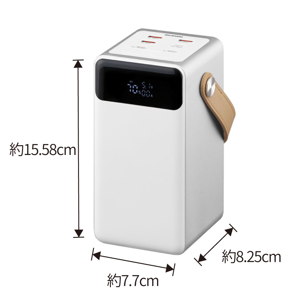 ●バッテリー容量/60000mAh●最大出力/Type-C:100W、合計:98W(3ポート)●端子/Type-A:3、Type-C:3●パススルー充電対応●ライト/調光:3段階、連続稼働時間:約144時間●本体充電時間/約5時間●防水・防塵/IP54●商品サイズ/約幅7.7×奥行8.25×高さ15.58cm●製品重量/約1.36kg