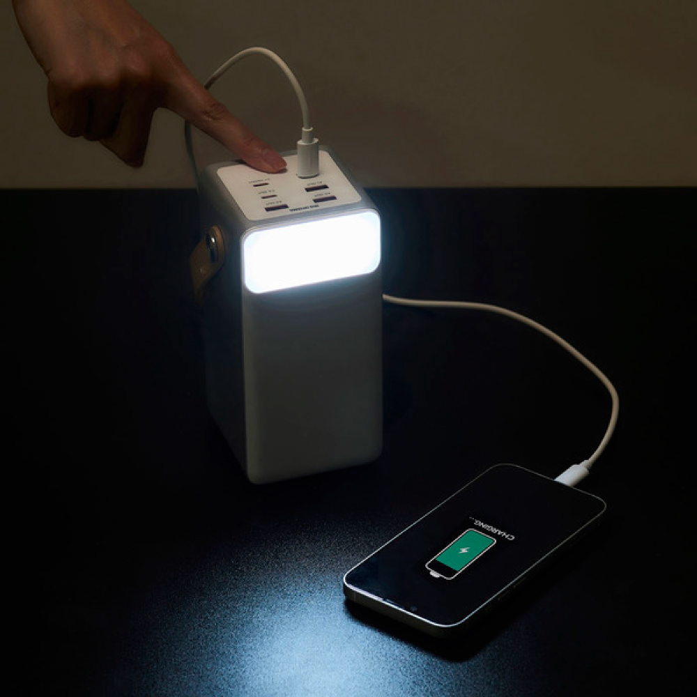 外出時の充電だけでなく、被災停電時やレジャーにも使えます。コンパクトなサイズながら、60000mAhの大容量バッテリー。スマートフォンやPC、カメラの充電は複数回可能。電気毛布やサーキュレーター等の連続使用にも対応します。残量がひと目で分かるパネル。バッテリー残量や最後に接続された端子の電圧、電流を表示します。背面にはLEDライトを搭載しています。3段階の明るさ調整が可能。ライトのみの使用で約144時間点灯。