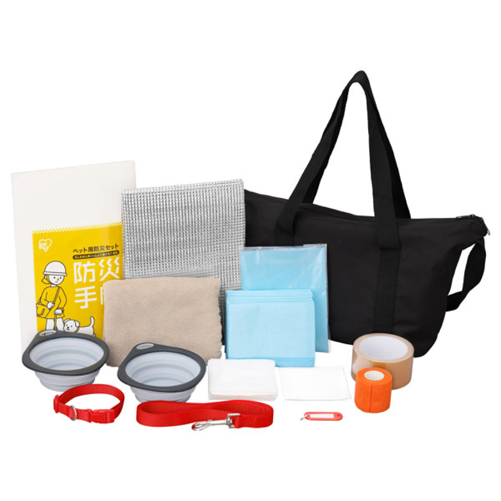 【セット内容】ショルダーバッグ、ディッシュ×2、アルミシート、おそうじシート(10枚入り)、折りたたみトイレ、ペットシーツ、防臭袋(20枚入り)、迷子札、首輪、リード、自着性テープ、タオル、ハンカチ(ガーゼ素材)、テープ、防災手帳●商品サイズ/約幅46×奥行14×高さ25cm●商品重量/約1kg