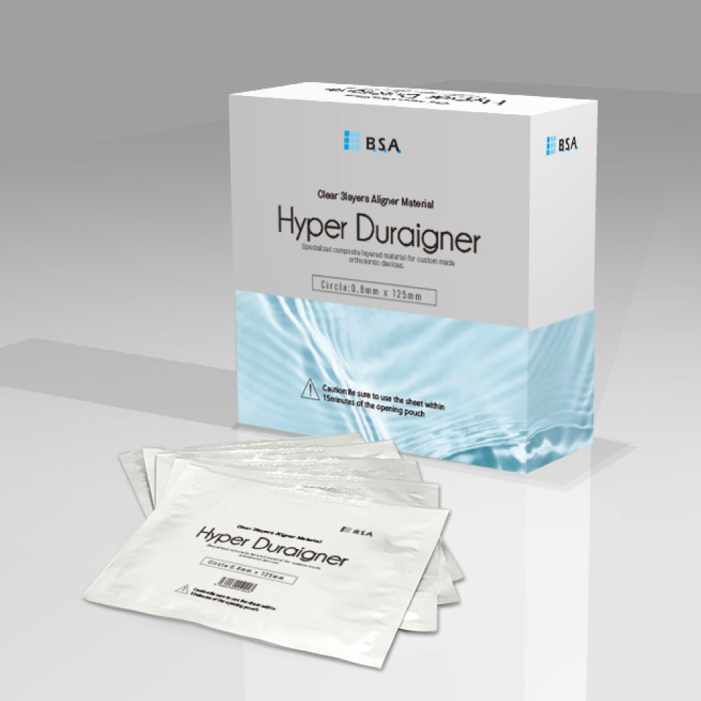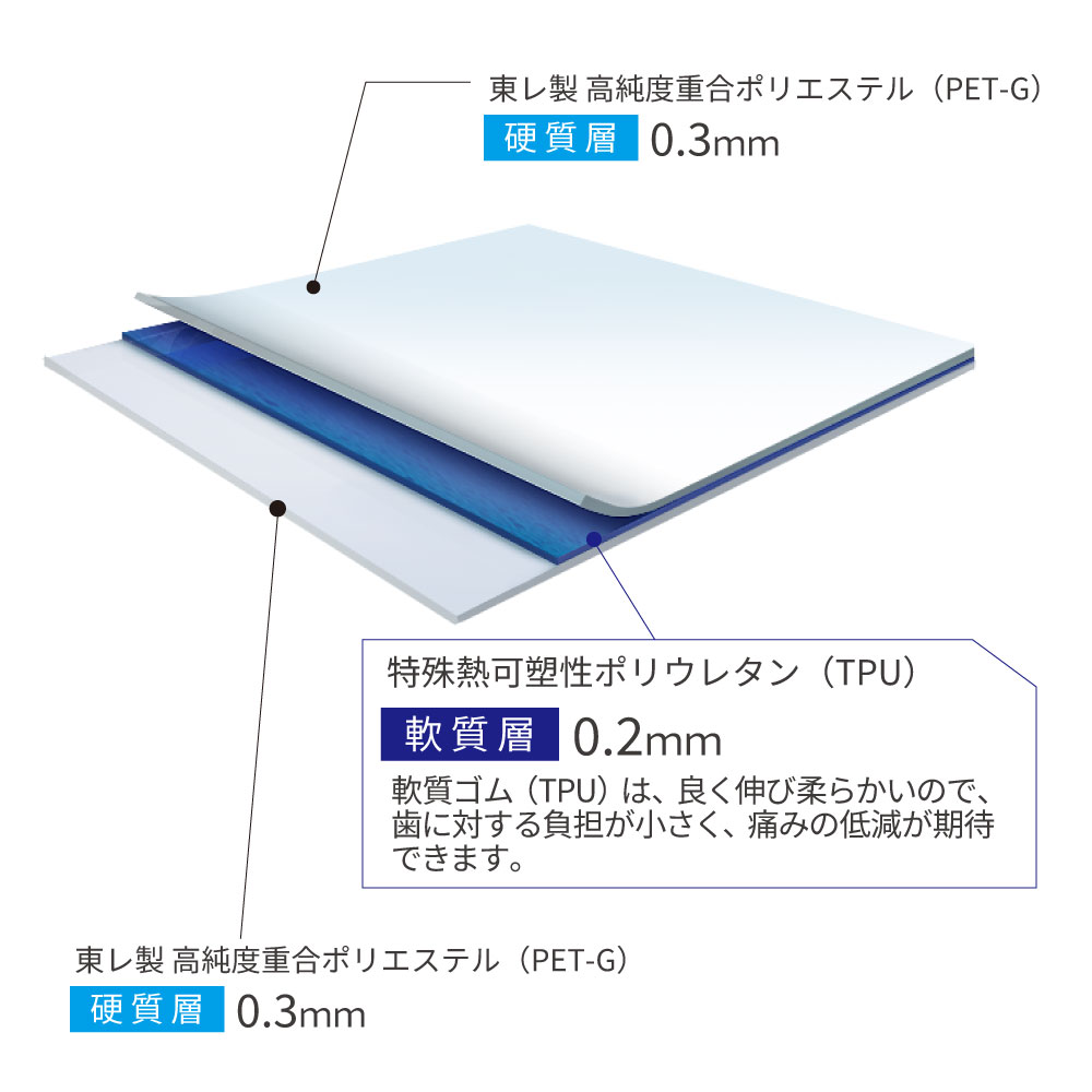 軟質層(中間層)によく伸び柔らかいTPUを使用することで歯に対する負担が非常に小さく矯正力に優れています。また、痛みの低減が期待できます。特殊製法により接着剤不使用でPET-Gと強固に結合しているため耐変色性も良好です。