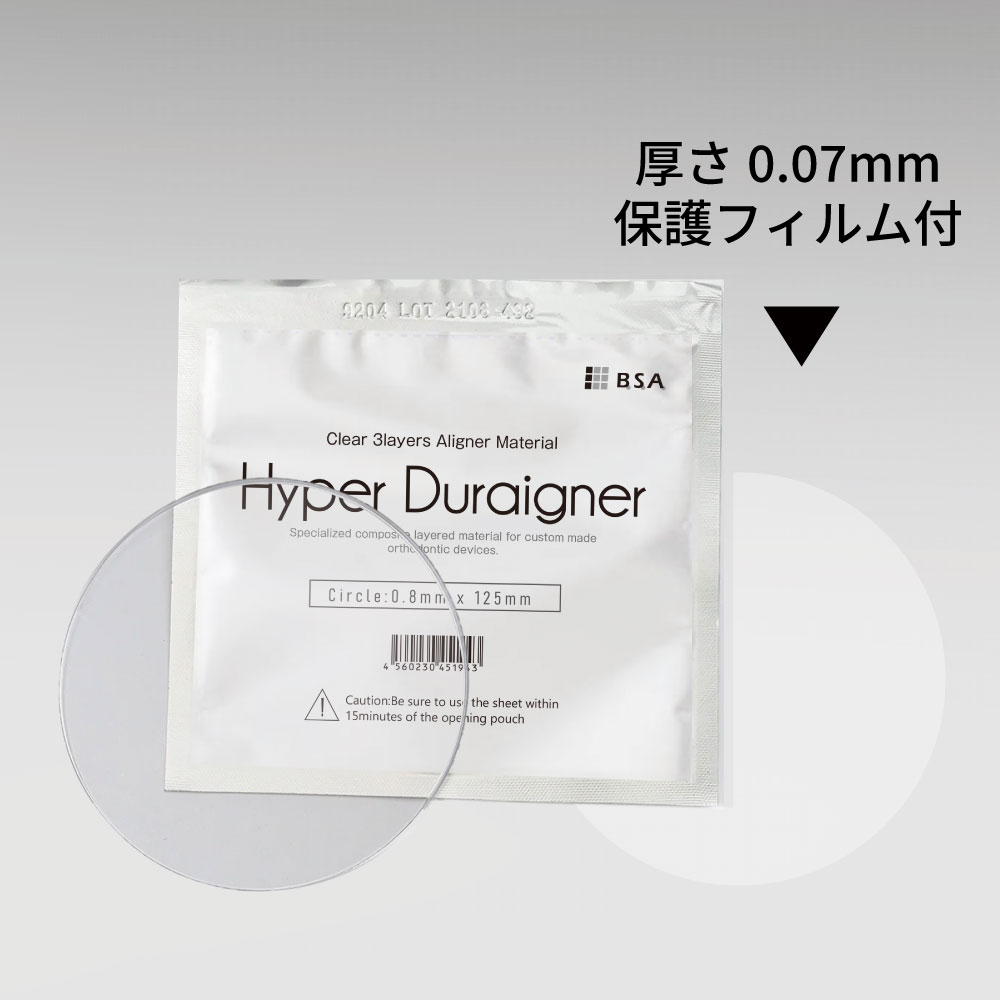 厚さ0.07mmのスプリント保護フィルムが付属しています。模型面にセットし、加圧成形することで模型とスプリントの着脱が容易にでき、スプリントの汚れ、傷を効果的に防止します。