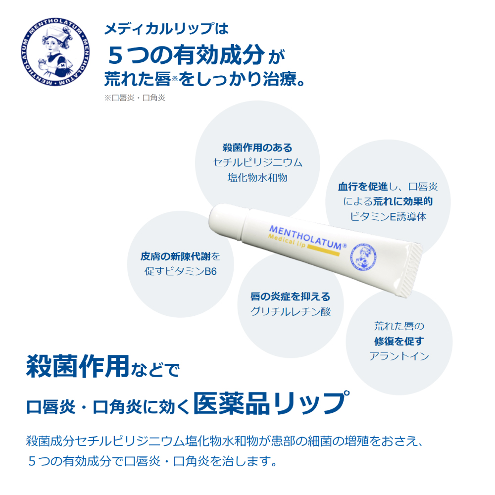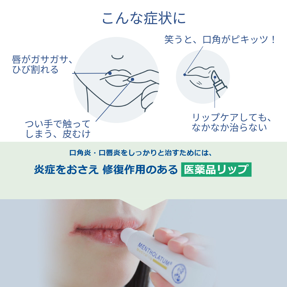 荒れた唇を治療し、しっとりなめらかにする医薬品のリップです。口唇のひびわれ、口唇のただれ、口唇炎、口角炎に。