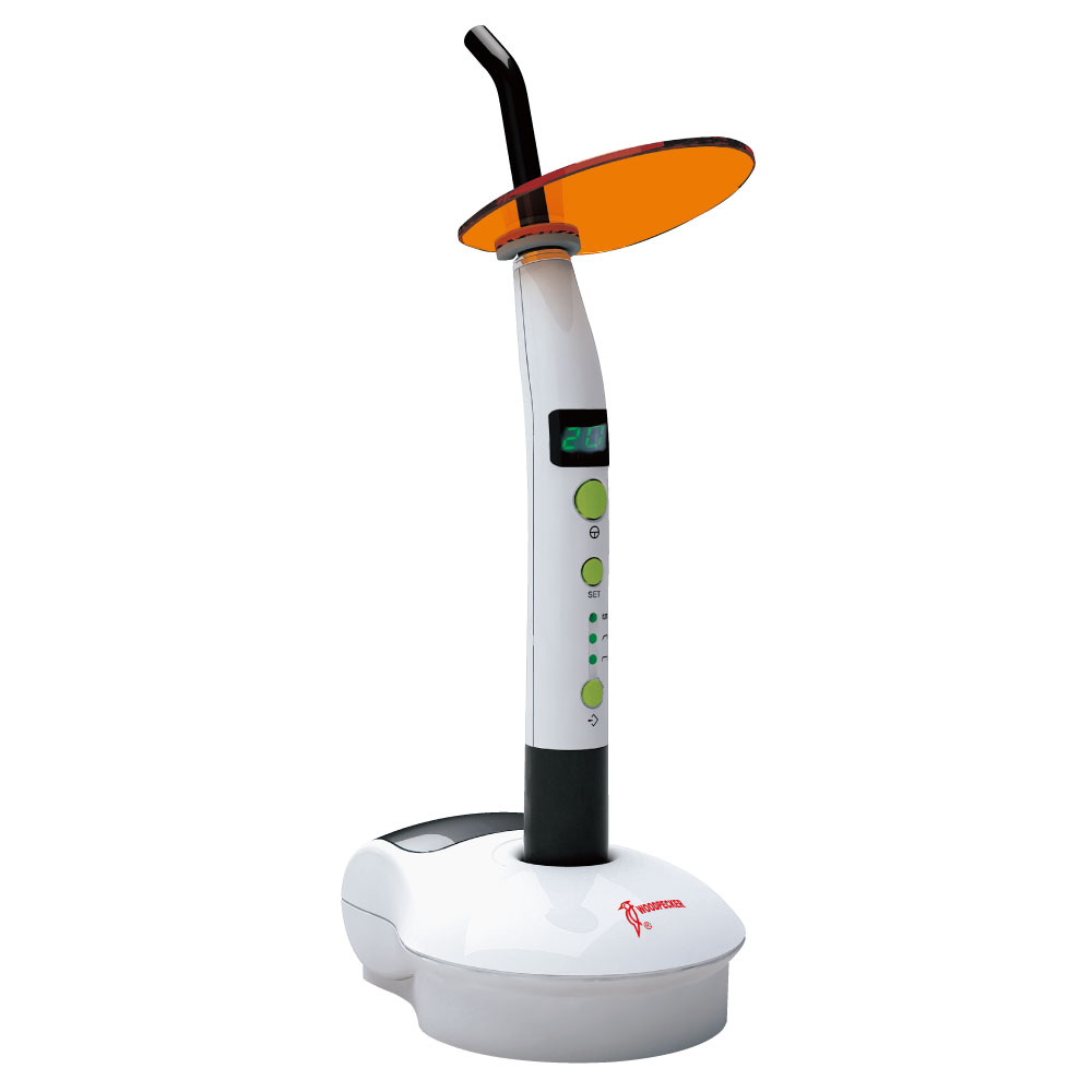 【セット内容】本体、オプティカルファイバー、バッテリー2個、アイガード2枚、ACアダプター、充電ベース、レジン重合震度測定器●中国製●出力:1500mW●波長域:420~480nm●120g●照射回数:10秒照射x約200回●保証期間/1年※一般的名称:歯科重合用光照射器 届出番号:23B2X00017000216