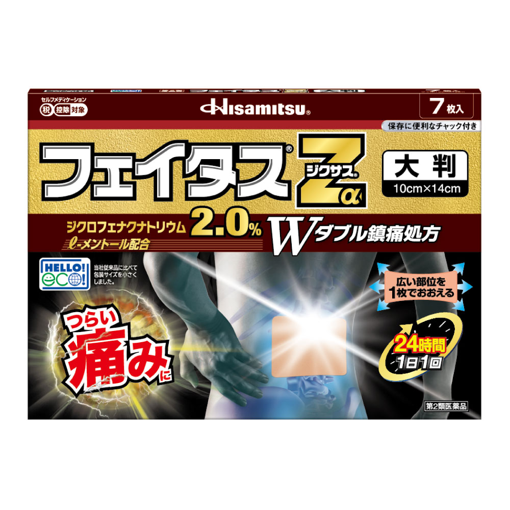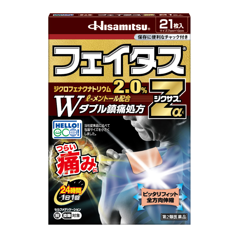 効きめ成分ジクロフェナクナトリウム2.0%が、いつもより激しい痛みに優れた効きめをあらわします。鎮痛消炎成分ジクロフェナクナトリウムをOTC最高濃度2.0%※配合。L-メントール3.5%配合で効果感がアップ!1日1回24時間持続。効きめ成分ジクロフェナクナトリウムが1日中持続します。短辺の伸縮性が向上しフィット感がアップ。剥がすときの皮膚へのダメージも軽減しました。※ジクロフェナクナトリウム含有貼付剤として(2016年3月末現在)