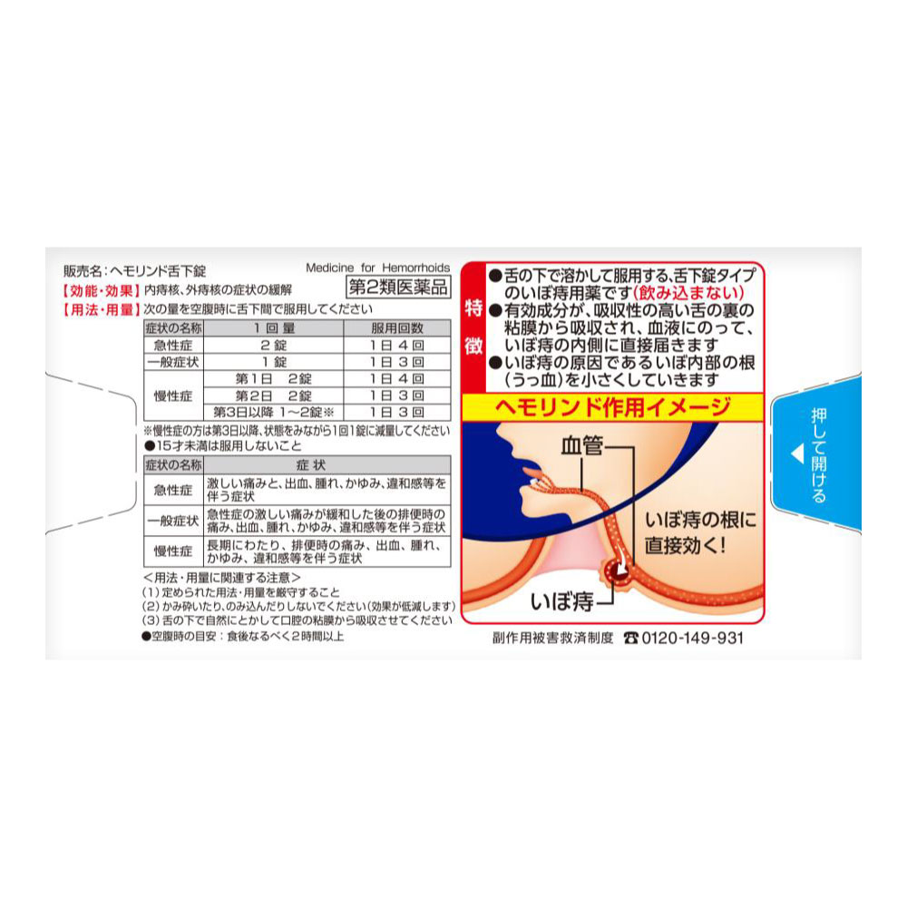 舌の下で溶かして服用する、舌下錠タイプのいぼ痔用薬です。有効成分が、吸収性の高い舌の裏の粘膜から吸収され、血液にのって、いぼ痔の内側に直接届きます。いぼ痔の原因であるいぼ内部の根(うっ血)を小さくしていきます。