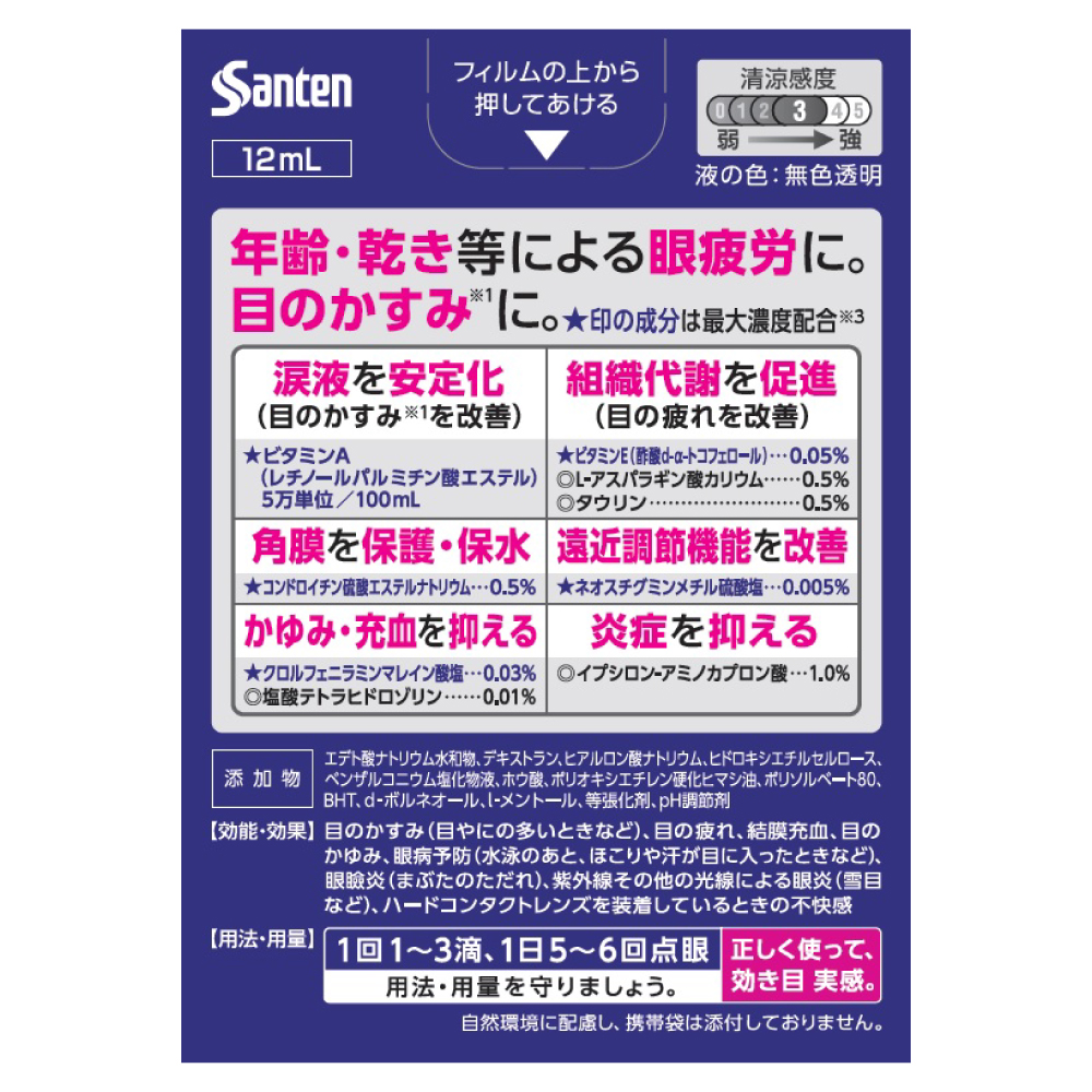 考え抜かれた9種の有効成分をバランス良く配合。年齢による目の機能低下などが原因の眼疲労や、目のかすみ(目やにの多いときなど)に効果を発揮する目薬です。