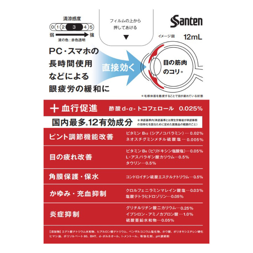 ピント調節機能を改善して目の疲れを緩和します。血行を促進して目の疲れを改善します。角膜を保護・保水して乾き等による目の疲れを改善します。
