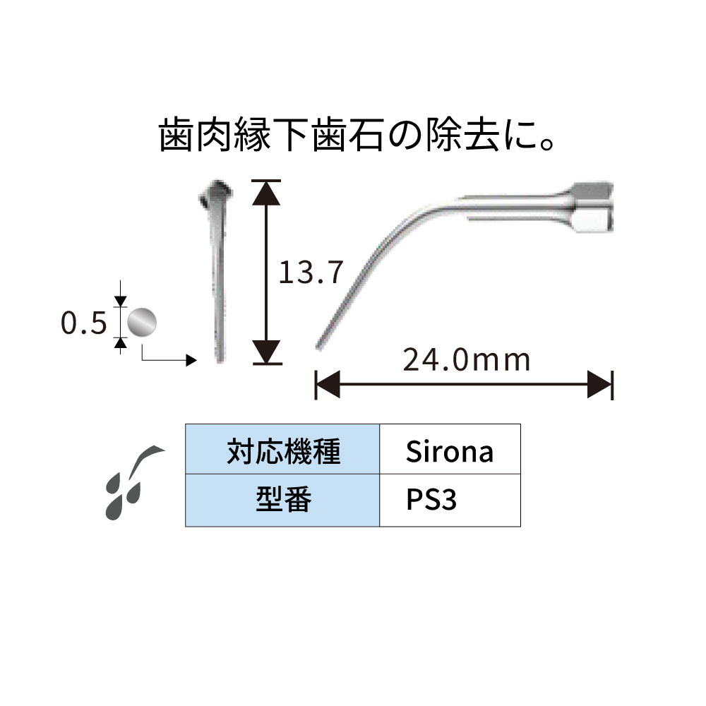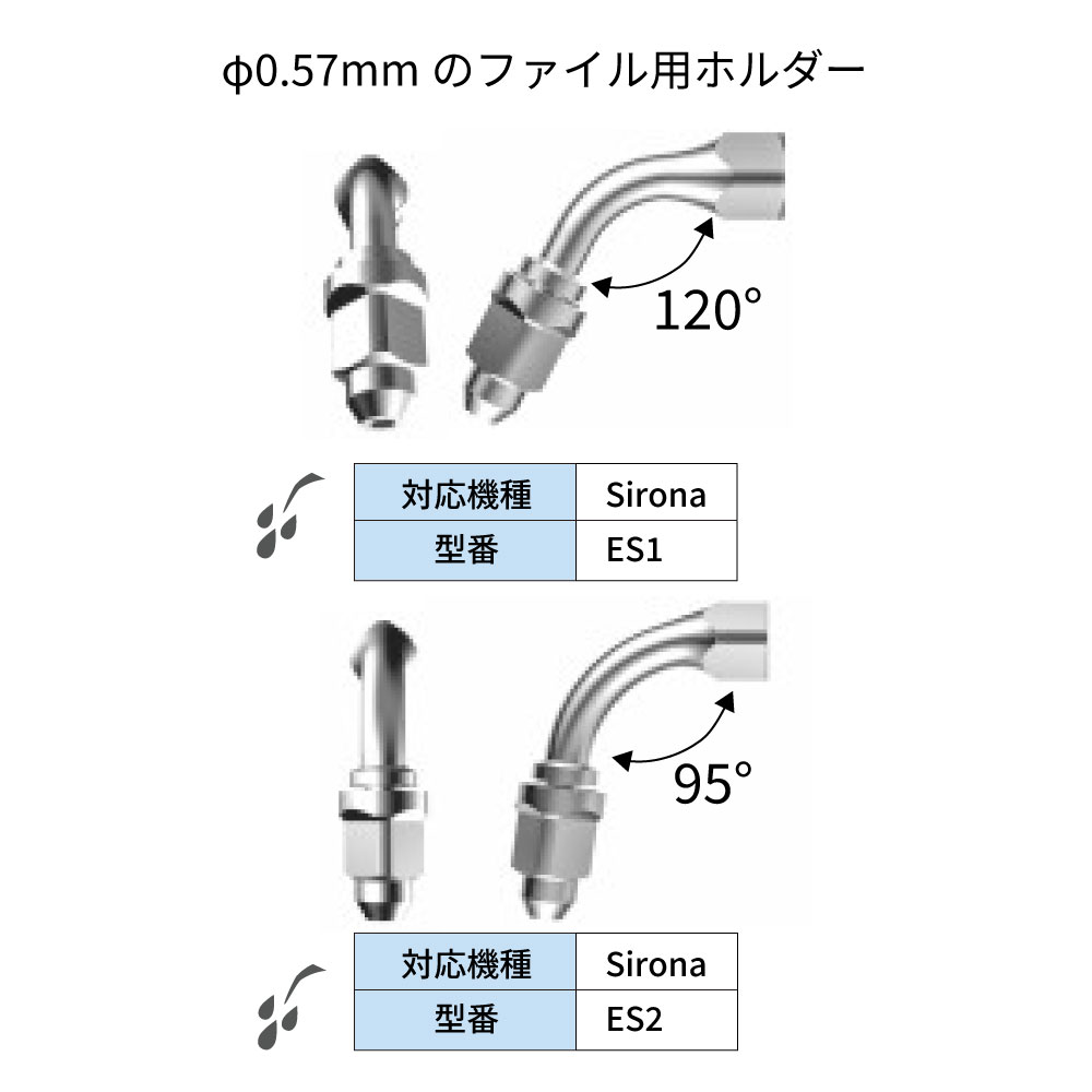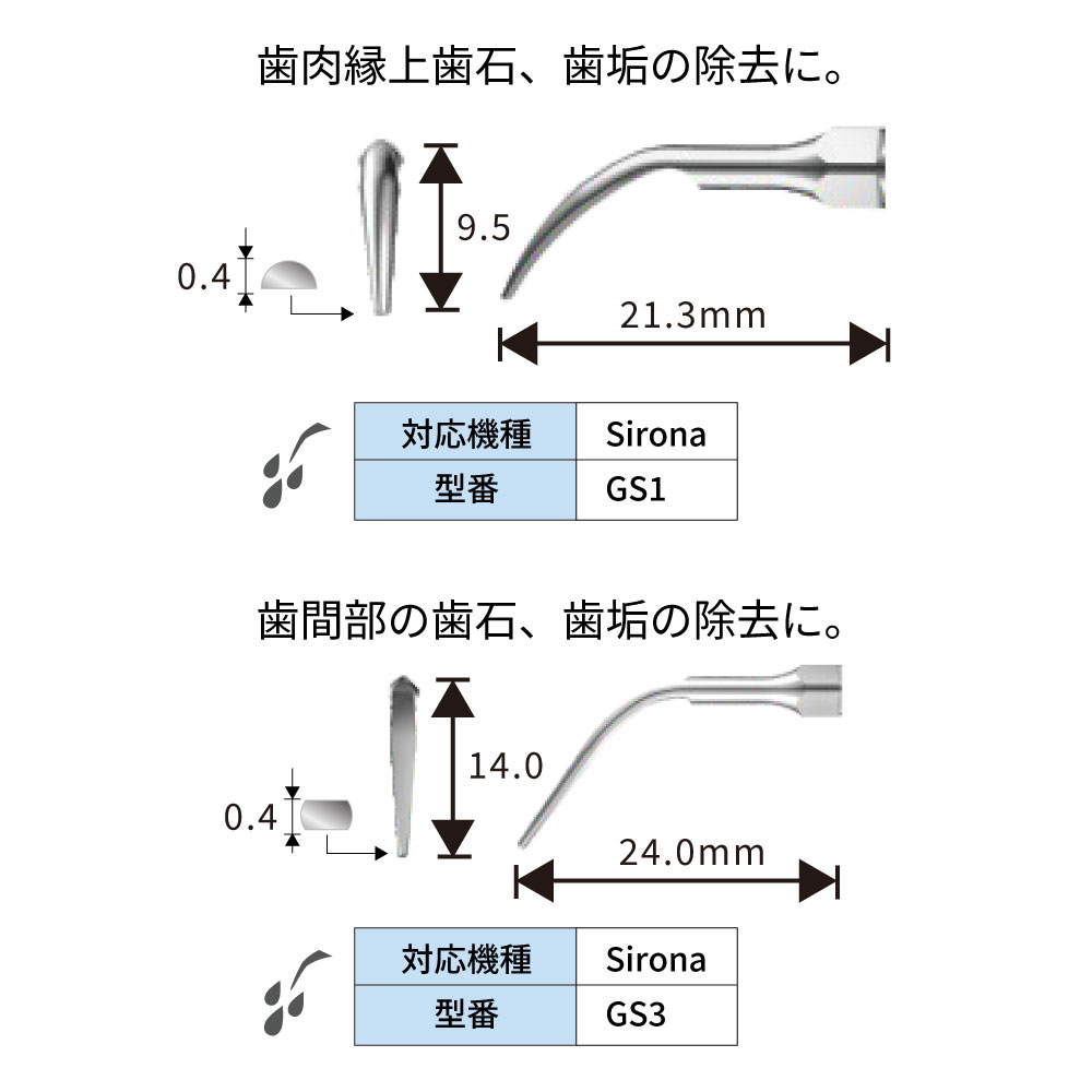 GS1、GS4は歯肉縁上歯石、歯垢の除去に。GS3は歯間部の歯石、歯垢の除去に。PS1、PS3は歯肉縁下歯石の除去に。ES1、ES2はφ0.57mmのファイル用ホルダー。ES3は根管充填材加圧用ES3Dは先端ダイヤモンドコーティング。充填材除去等に。