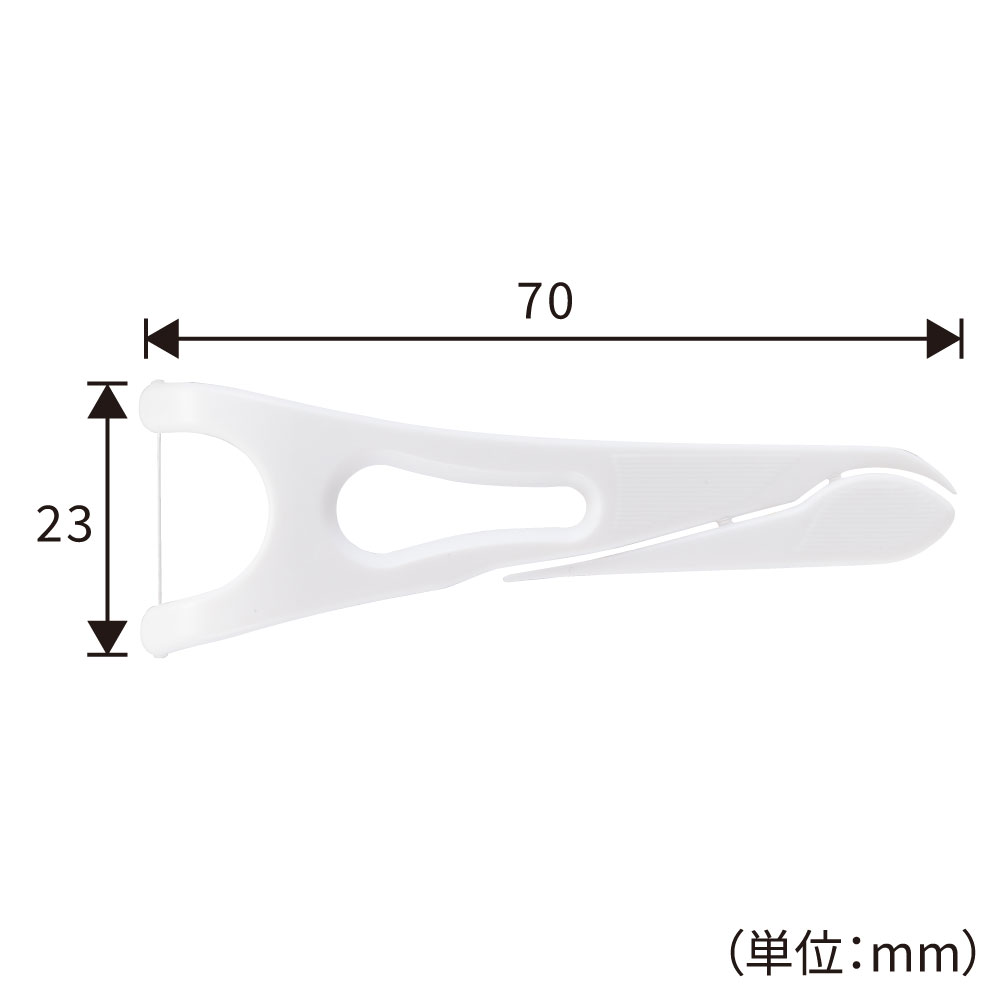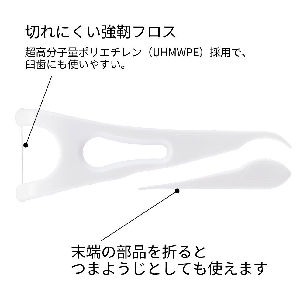 切れにくい強靭フロス:超高分子量ポリエチレン(UHMWPE)採用で、臼歯にも使いやすい。末端の部品を折ると、つまようじとしても使えます。