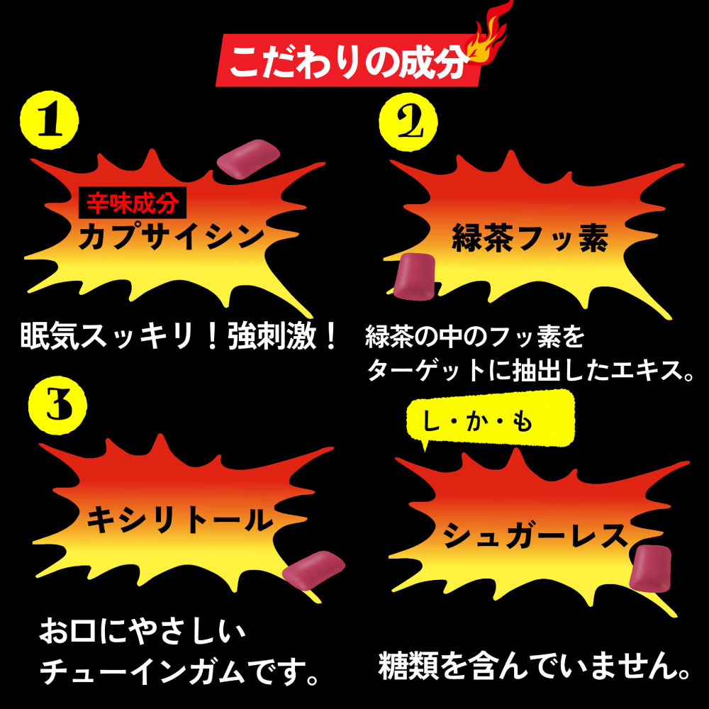強刺激です。辛味成分カプサイシン入り。緑茶フッ素、キシリトール配合。しかもシュガーレスです。キシリトール配合なので物販にもおすすめです。