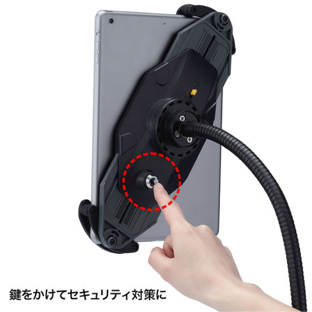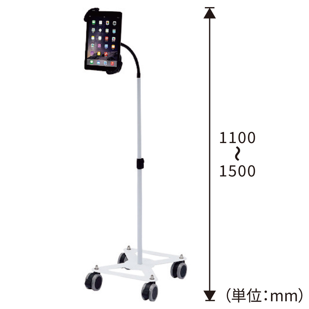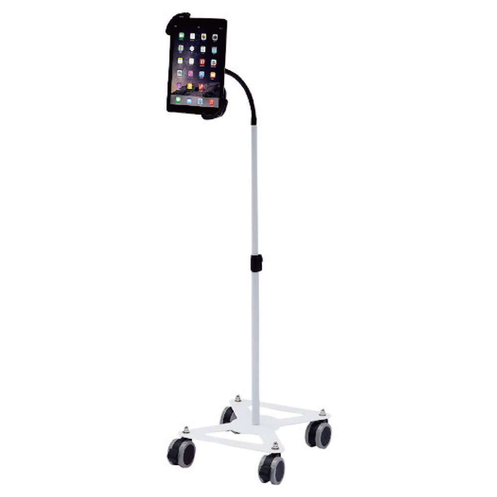 7~11インチのiPad、タブレットを取り付け可能なホルダー付スタンドです。キャスターは直径3インチ(約75mm)の大型キャスターです。上部アーム部はフレキシブルアームになっており、任意の位置で調整することができます。支柱部は高さ調整が可能です。ホルダーは機器を対角で挟み込むタイプで、しっかりホールドされます。ホルダーには鍵が付いており、セキュリティ対策ができます。ホルダーはアームに取付けた状態で360度回転します。組み立て式。