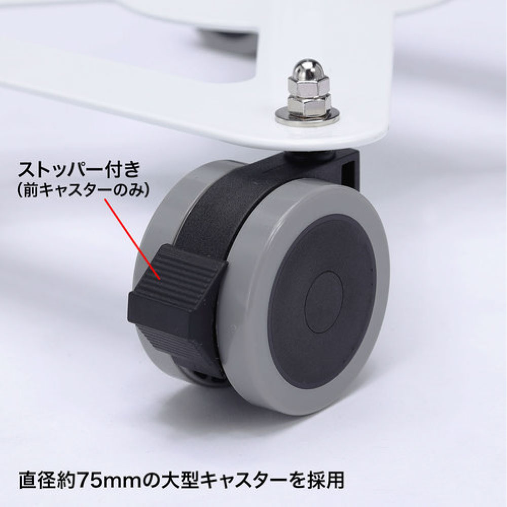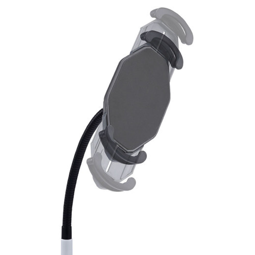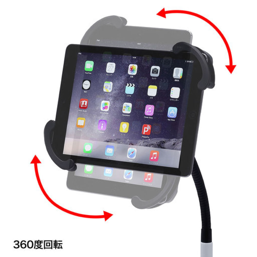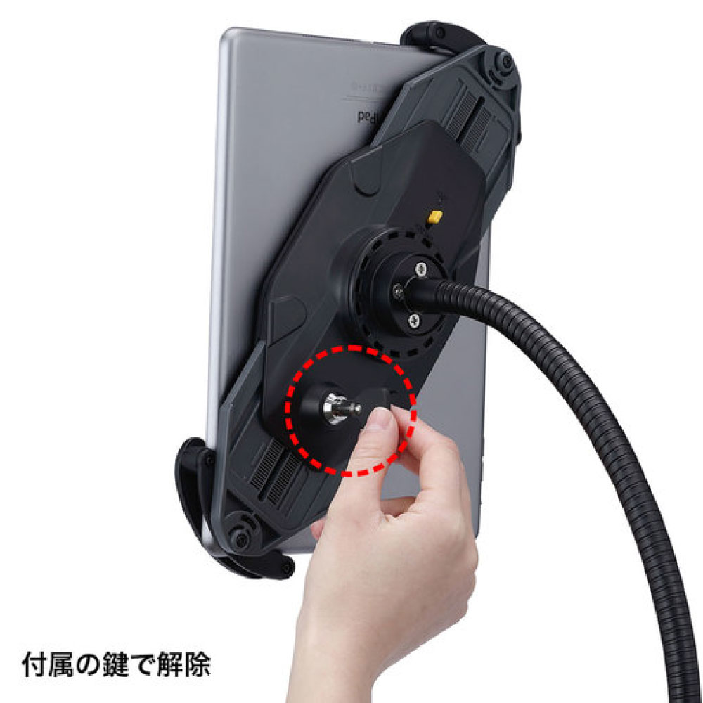 7~11インチのiPad、タブレットを取り付け可能なホルダー付スタンドです。キャスターは直径3インチ(約75mm)の大型キャスターです。上部アーム部はフレキシブルアームになっており、任意の位置で調整することができます。支柱部は高さ調整が可能です。ホルダーは機器を対角で挟み込むタイプで、しっかりホールドされます。ホルダーには鍵が付いており、セキュリティ対策ができます。ホルダーはアームに取付けた状態で360度回転します。組み立て式。