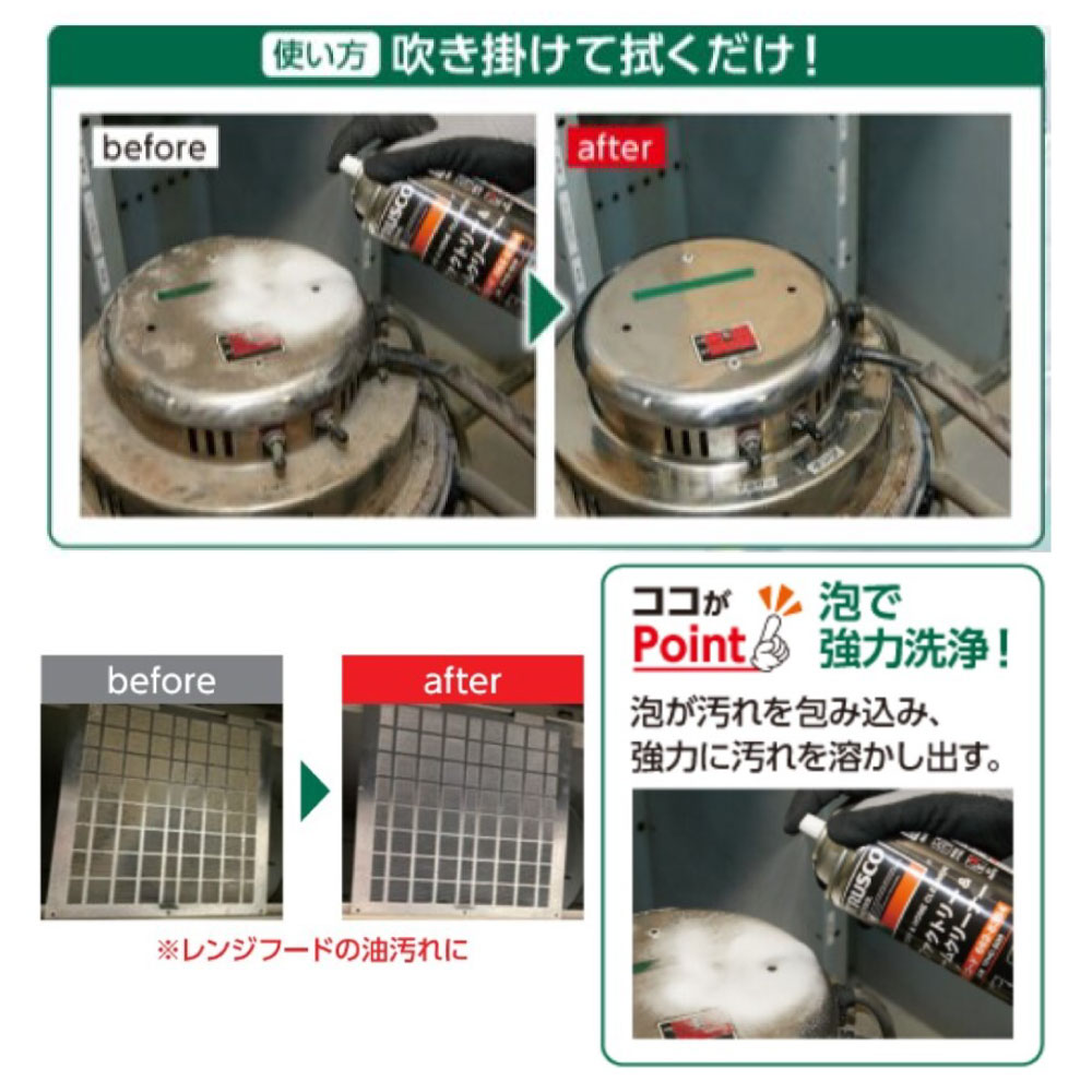 スプレーした泡が汚れを強力に溶かします。換気扇や電灯の笠などの汚れ落としに。