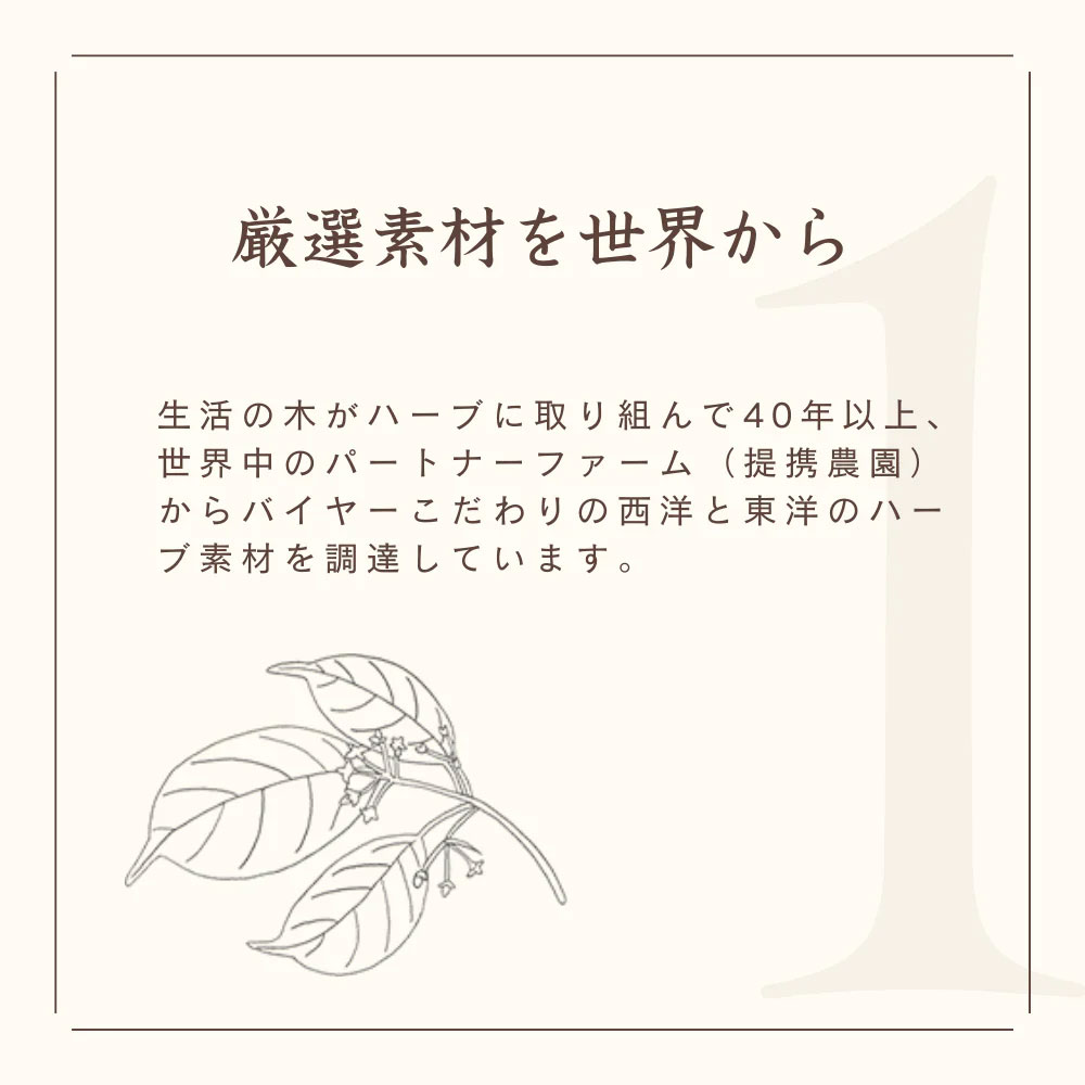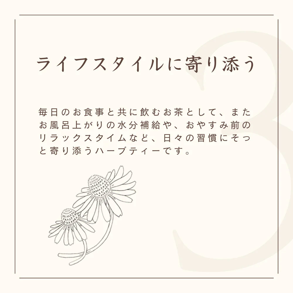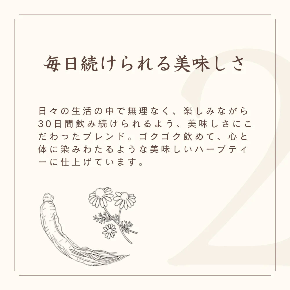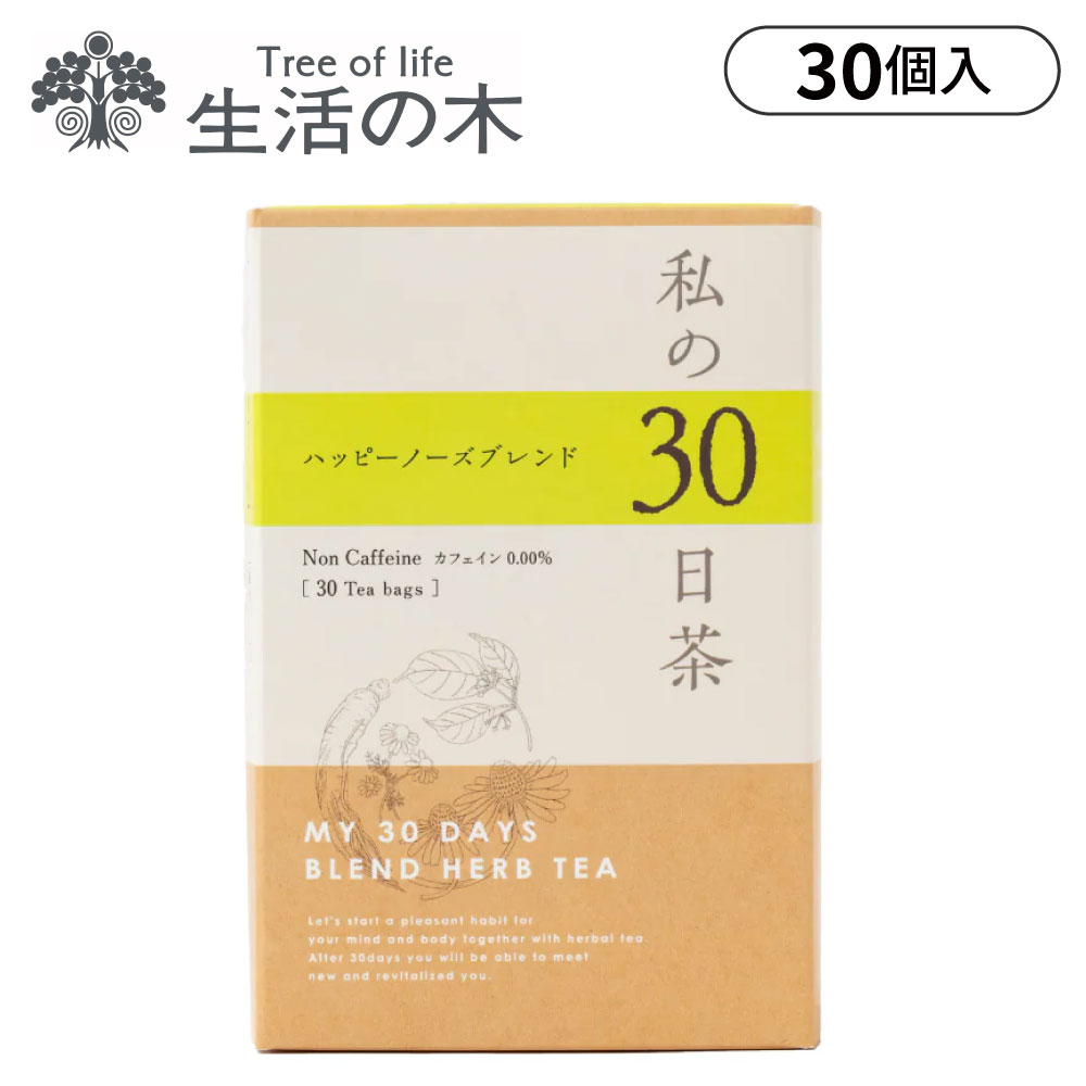心と体に気持ち良い習慣を始めていただくための「私の30日茶」です。日々の生活の中で無理なく、美味しく、楽しみながら飲み続けられるよう、とにかく美味しさにこだわりました。ゴクゴク飲めて、身体に染みわたるようなブレンドに仕上げています。ハッピーノーズブレンドは、ヒソップやネトル、エルダーフラワーや甜茶など13種類のハーブを配合しています。【30ティーバッグ】まずは30日召し上がっていただくために。携帯に便利な個包装タイプなので、オフィスや旅行先への持ち運びにも。