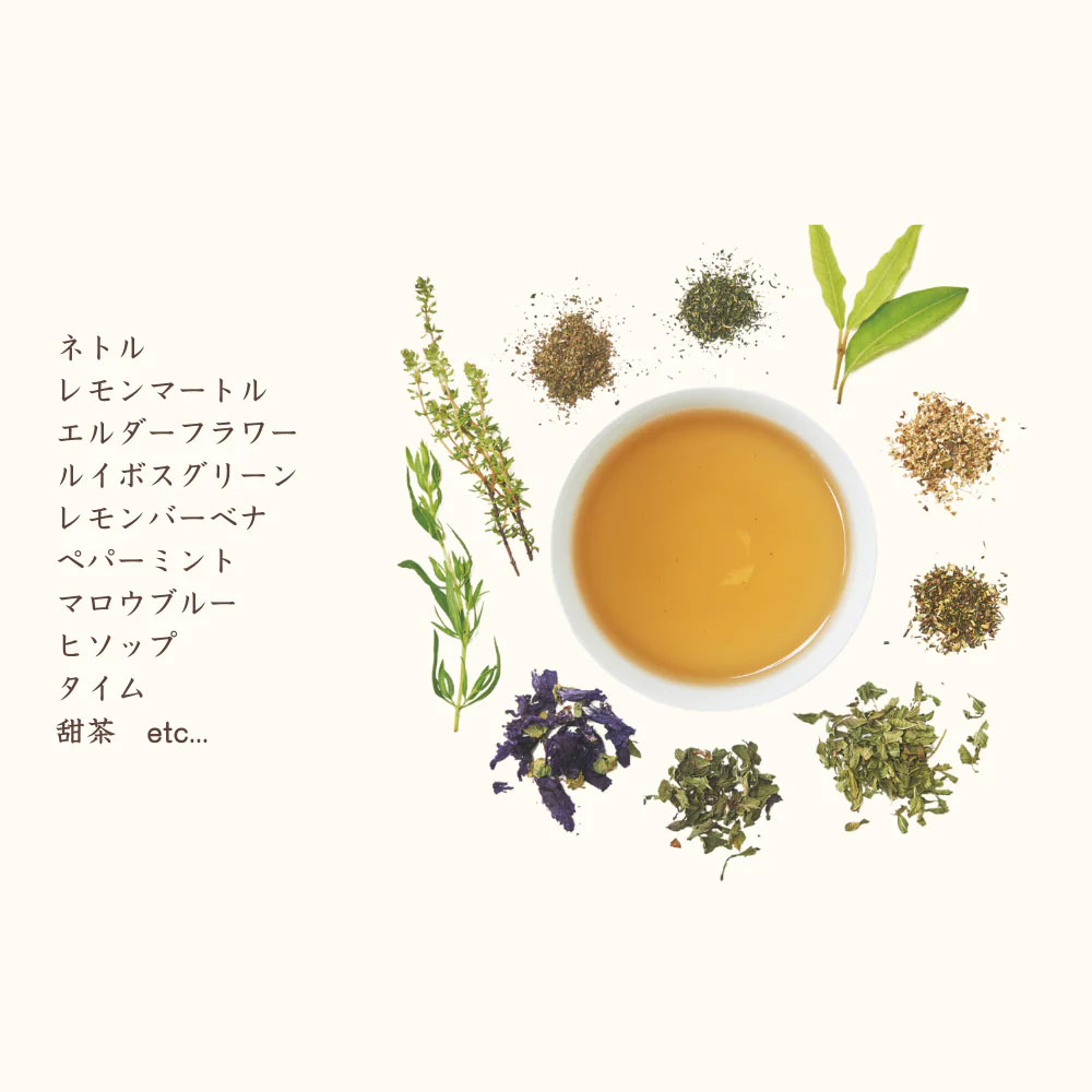 ●原材料/ヒソップ(フランス産)、ルイボスグリーン、レモンバーベナ、ペパーミント、レモンマートル、タイム、ネトル、エルダーフラワー、エキナセア、ホーリーバジル、マロウブルー、アイブライト、甜茶●お召し上がり方ホットの場合:温めたカップにティーバッグを入れ、沸騰させたお湯約180mlを注ぎ、5~6分置いてからお召し上がりください。アイスの場合:通常の半分程度のお湯で濃い目に出し、氷を入れた耐熱グラスに直接注いでください。 ※水出し用ではありません。