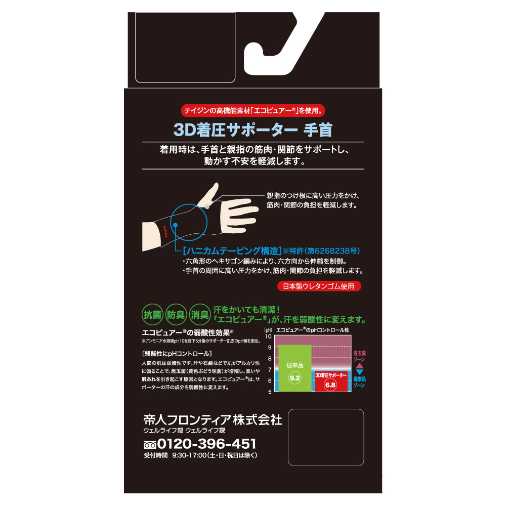 着用時は、手首と親指の筋肉・関節をサポートし、動かす不安を軽減します。日本製ウレタンゴムを使用しています。