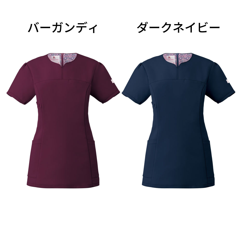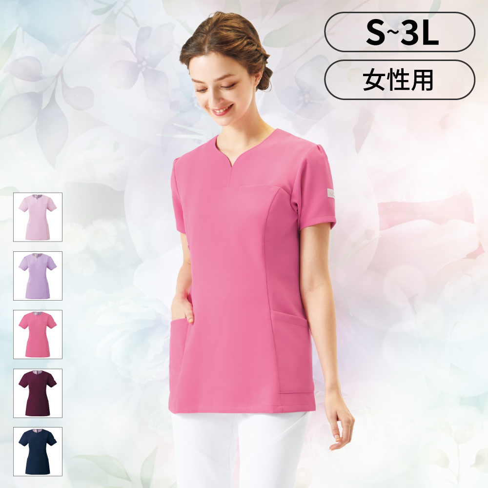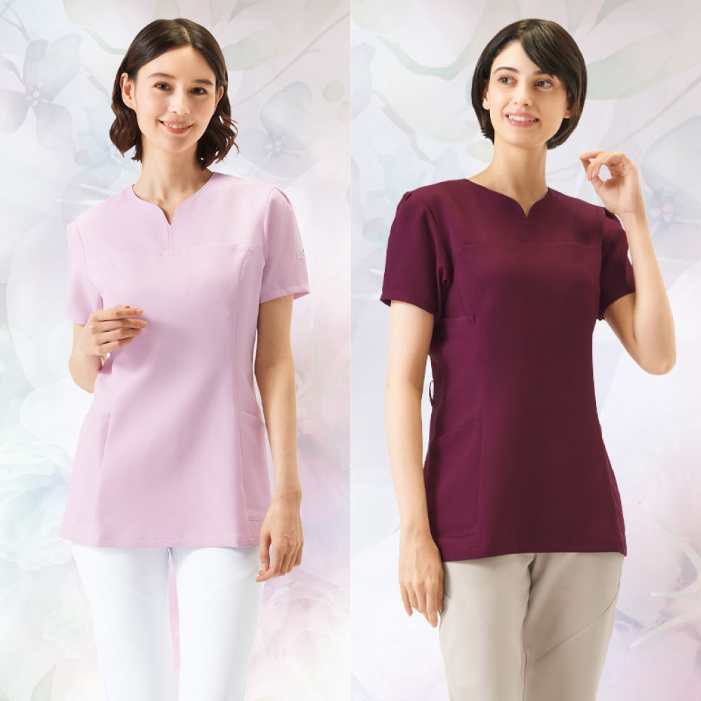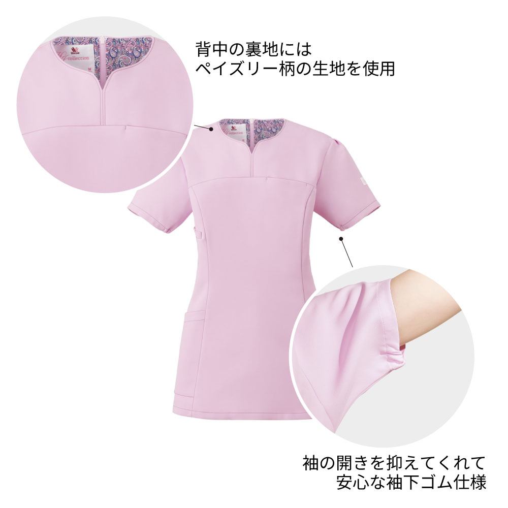 ハート型の襟元が女性らしいワコールのレディーススクラブです。スッキリなのに動きやすいウェアです。