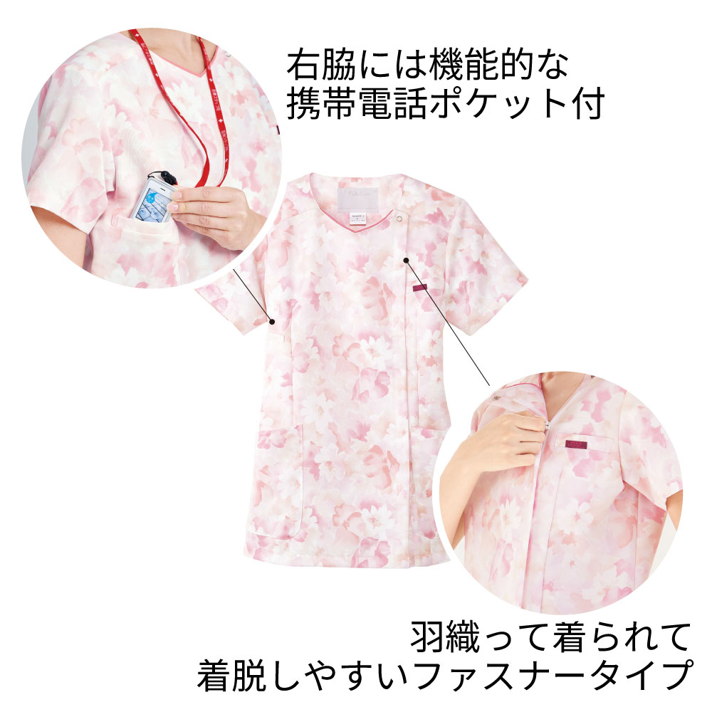花柄のウエアは患者さまに「明るい」「やわらかい」「優しい」といったイメージを与えると言われています。洗濯しても色褪せしにくい高耐久素材を使用しています。
