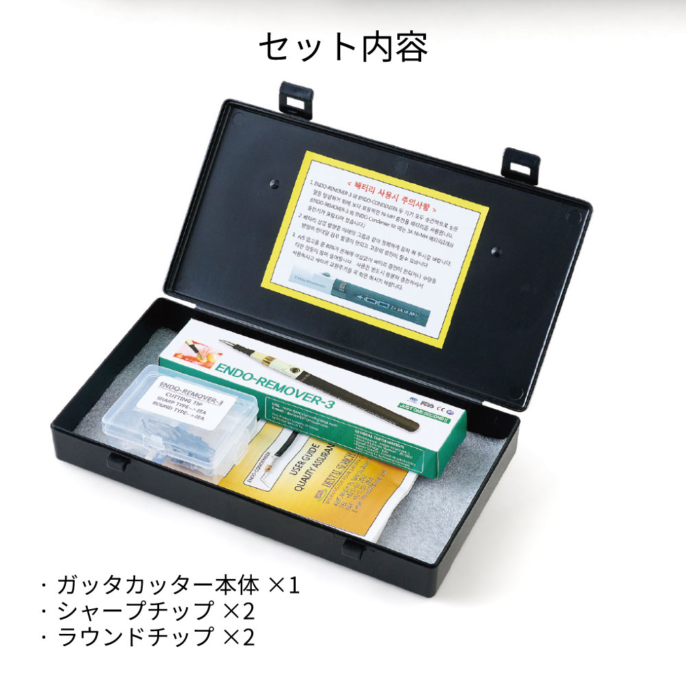 【セット内容】ガッタカッター本体×1個、シャープチップ×2個、ラウンドチップ×2個●材質/本体:ABS樹脂、アルミニウム チップ:ガラス繊維強化ナイロン、ステンレス胴※一般的名称:歯科用練成充填形成器 届出番号:27B2X00268X00149